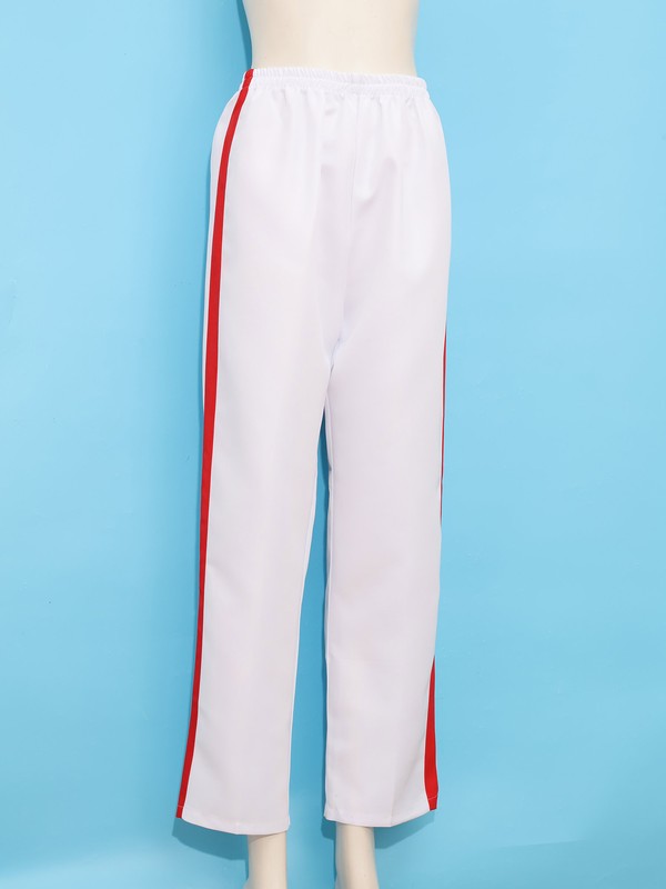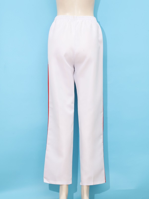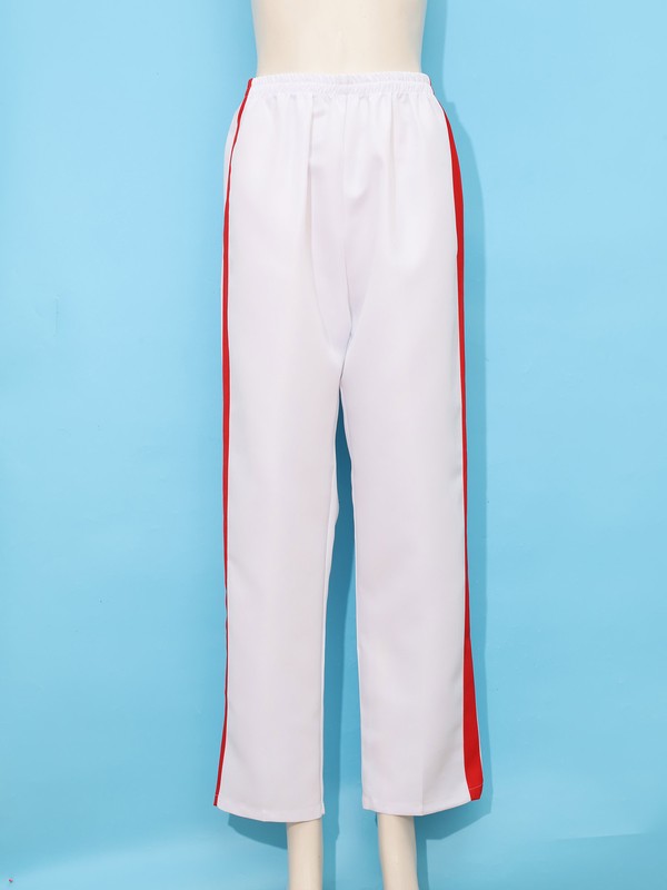 The high waist uniform pants have elastic waist, straight legs and color block patchwork at sides, are comfy to wear, and look formal.