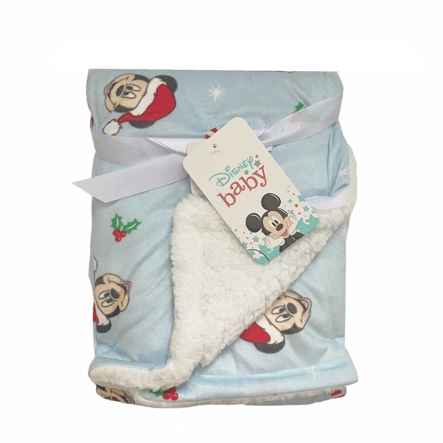This holiday season, let your little one snuggle up with Mickey in delightful comfort! This super soft blanket boasts a brushed minky fleece side that showcases a jolly festive Mickey print set against a cheerful soft blue background. The cozy reverse side is crafted from creamy white plush sherpa, perfect for those chilly winter nights. Measuring a generous 30" x 40", this blanket will wrap your child in warmth and holiday cheer all season long. Made of 100% polyester, it's the perfect gift for creating magical memories!