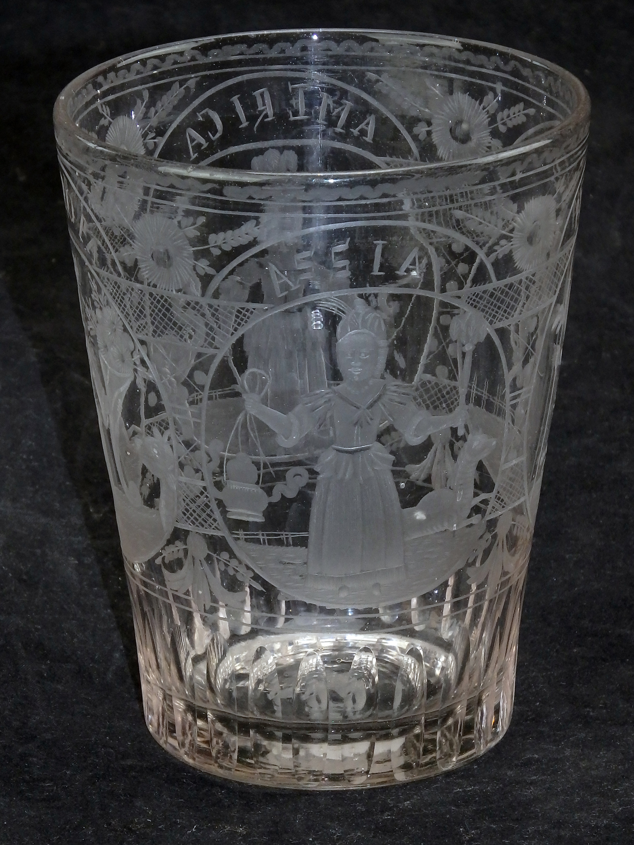 Wandung mit umlaufend geschliffenem Dekor mit den personifizierten Allegorien der vier Erdteile „Africa“, „America“, „Assia“ und „Evoropa“. Europa ist als Königin mit Zepter und Füllhorn mit Blumen sowie Pferd im Hintergrund dargestellt, Asien als Edeldame mit Palmwedel und dampfenden Teekessel mit Fabeltier im Hintergrund, Afrika als Krieger mit Federschmuck, Bogen und Hellebarde sowie Amerika als Edeldame mit Federschmuck und Pfeil und Bogen und Elefant im Hintergrund.