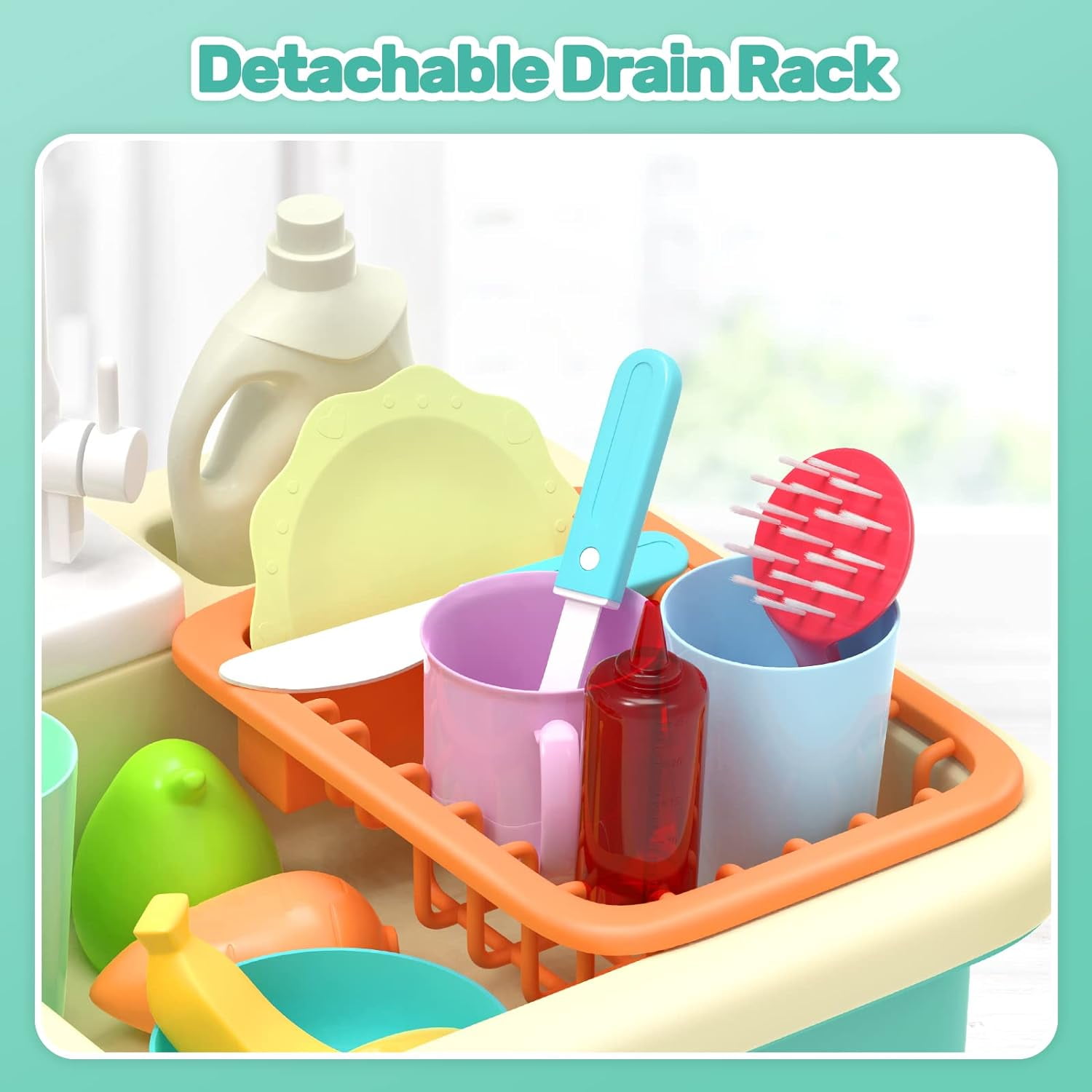 Kids Sink Toys with Running Water: This kids play sink toy comes with an upgraded electric faucet for more power and safety. Just fill up the base of the sink with water and turn the handle to make water pour from the faucet. The automatic water cycle system makes children enjoy a mini working kitchen without wasting water.