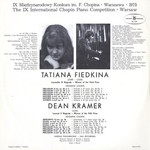 | MUZA SX-1336 Stereo Chopin: 4 Preludes, 2 Mazurkas, Scherzo in b flat / 3 Etudes, 4 Preludes Fiedkina Tatiana, Kramer Dean pianos Cover: VG+ Record: VG+ Plays EX, Chopin Competition 1975 | |