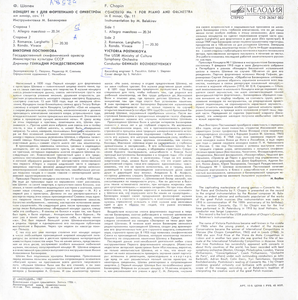 | MELODIYA C10-26367 Stereo Chopin: Piano Concerto 1 Postnikova piano Rozhdestvensky / USSR MoC Orch Cover: VG Record: VG+ Record close to EX | |