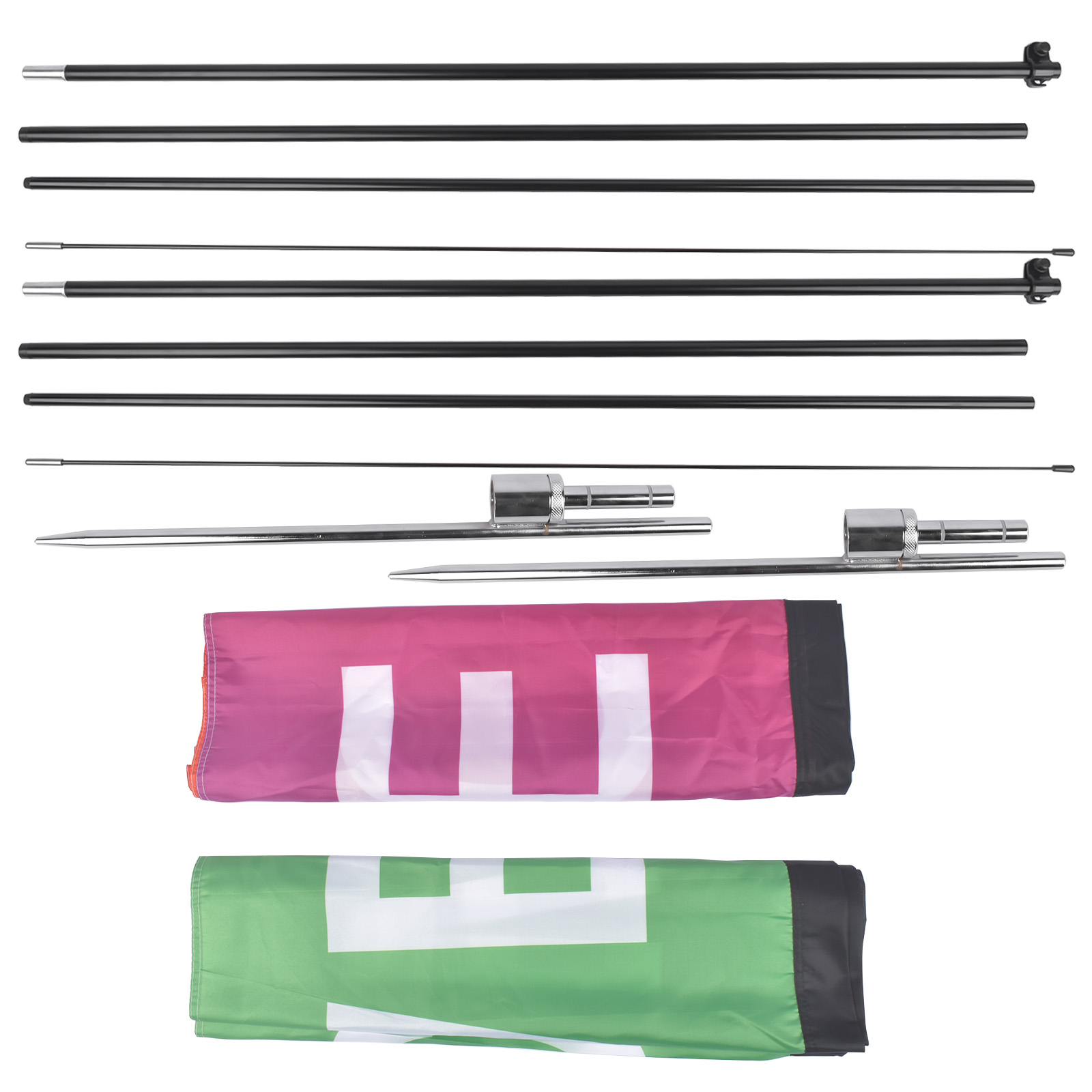 Package Included: 2x 1 set of flagpoles 2X Flag Face 2x Ground Spike |