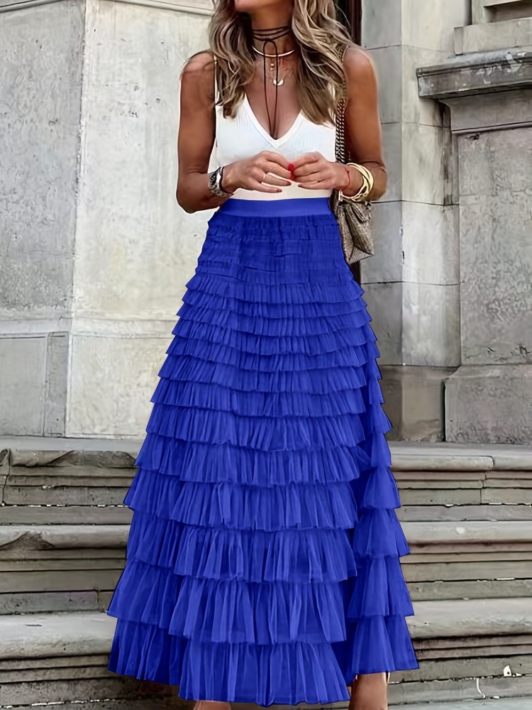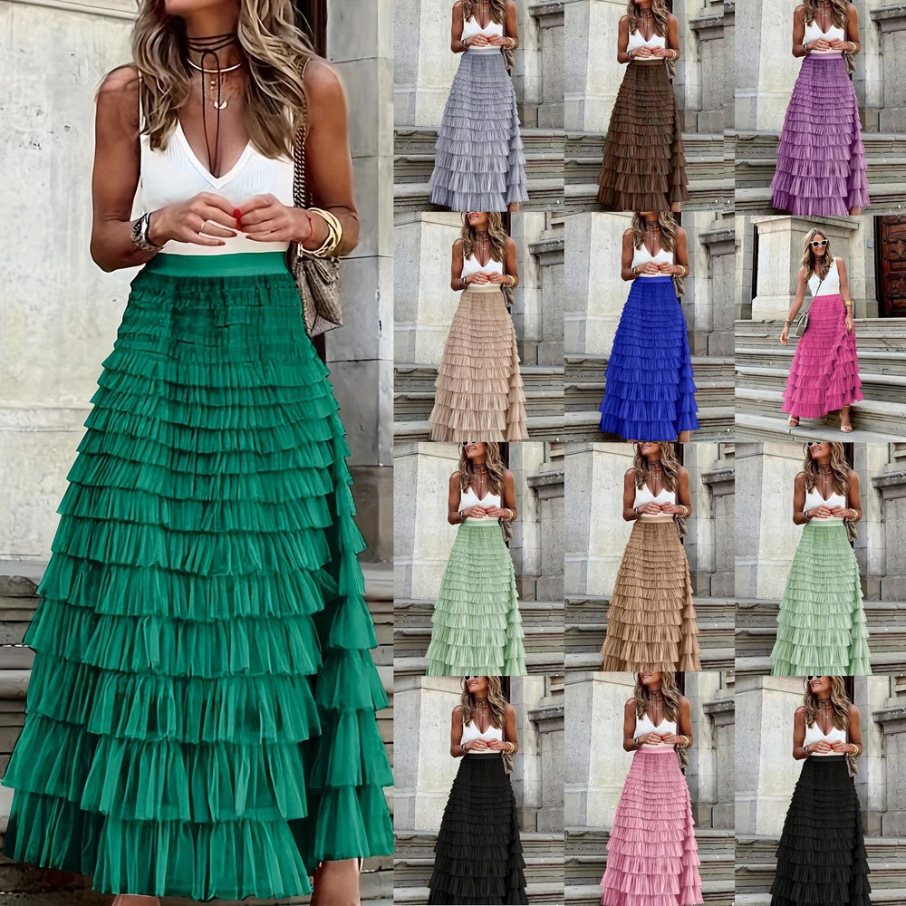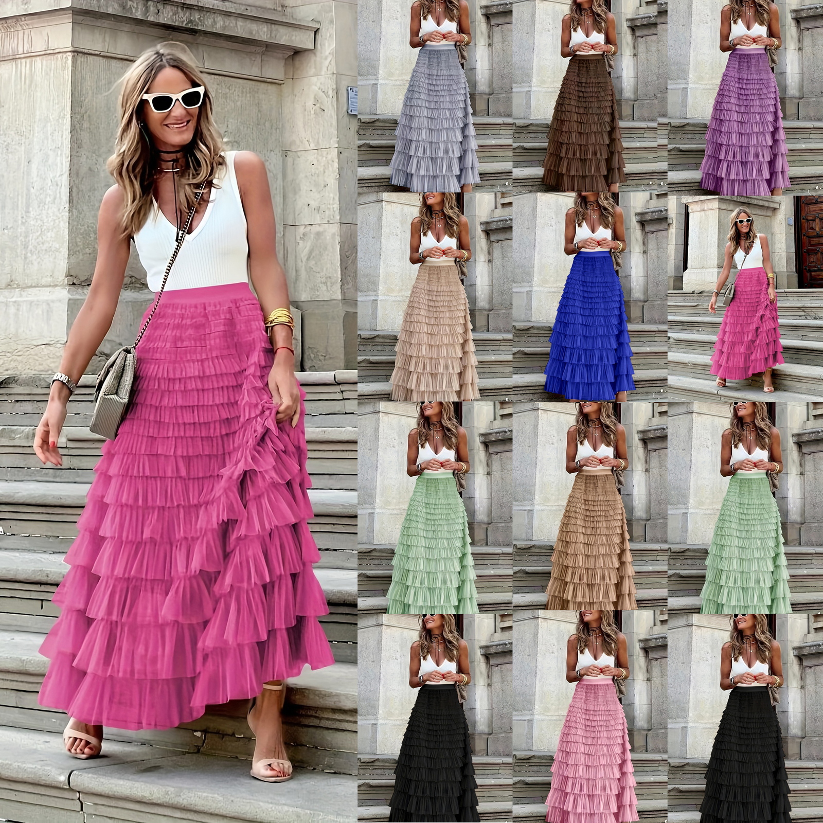 Womens Elastic High Waist Mesh Tulle Tutu Skirt Layered Pleated Maxi Long Dress