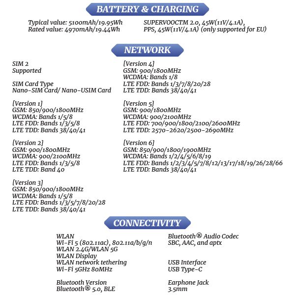 - Fast Charging: 45W SUPERVOOC Flash Charge powers up to 50%