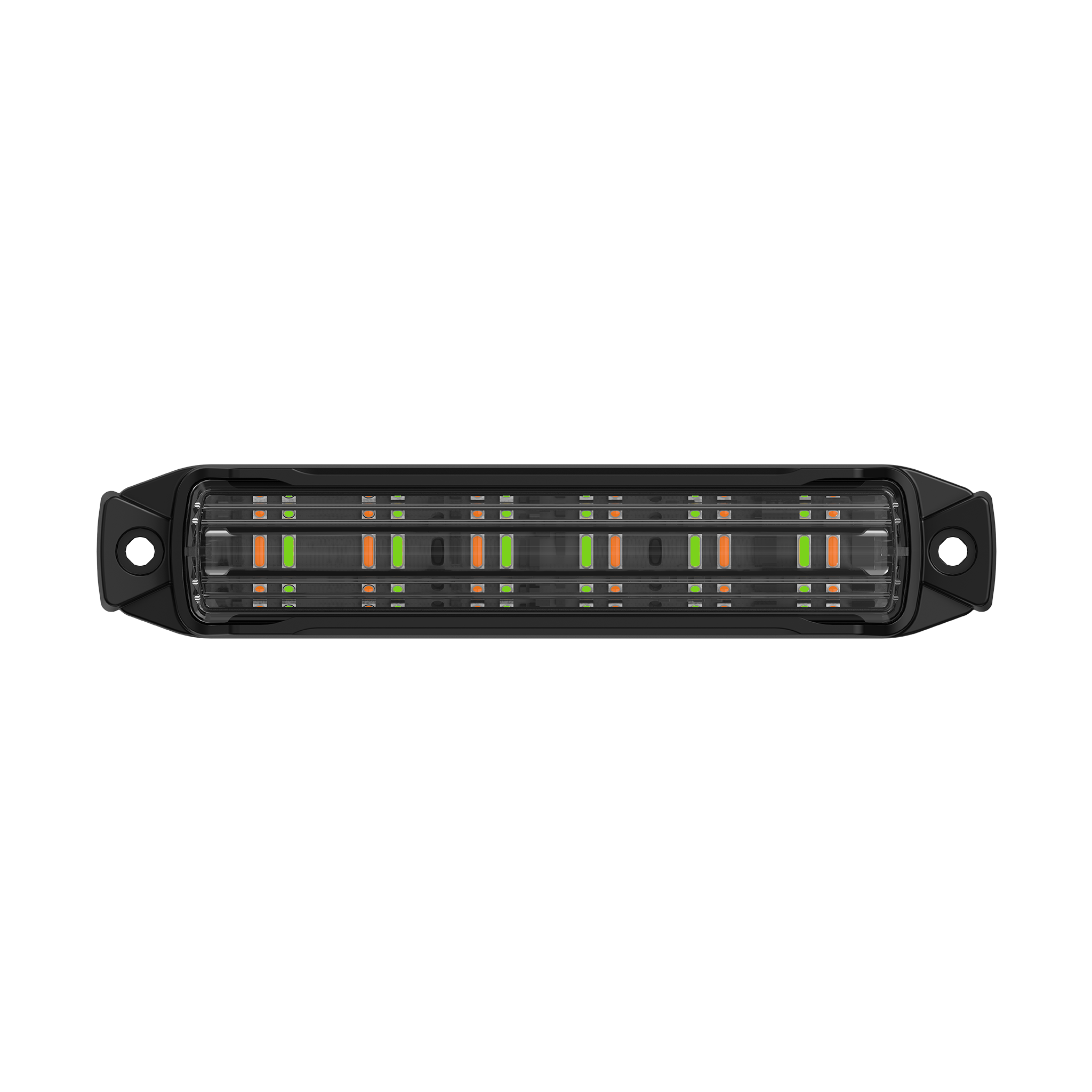 Work Bar Strobe 4, 4" LED Strobe Light, Amber/Green (1EA) BUILTBRIGHT® Work Bar Strobe 4 delivers a powerful light in a slim, compact design. Available in single & dual color options to meet any need to customize your vehicle or fleet. The strobe houses six (6) or twelve (12) premium quality 3W LEDs with linear optics to magnify the flash, with fifty four (54) flash patterns in dual color options. Three (3) user programmable memory modes allows you to preset three (3) different patterns based on your customized choice. The Work Bar Strobe 4 features a strong polycarbonate lens on an aluminum body and an aluminum protective bezel to maximize protection from debris impact and to absorb heat dispersion. This product can be fitted virtually anywhere on a vehicle in a fit-and-forget-it fashion. Boasting major industry requirements such as IP69K, SAE Class I and EMC R10, the product is backed with a five (5) year warranty. 12 and 24 VDC compatible Meets SAE J595 Class I, California Title 13, ECE R65, and R10 requirements 12 high-intensity LEDs behind a proprietary optical lens 3 user-programmable modes Dual color: Amber and Green