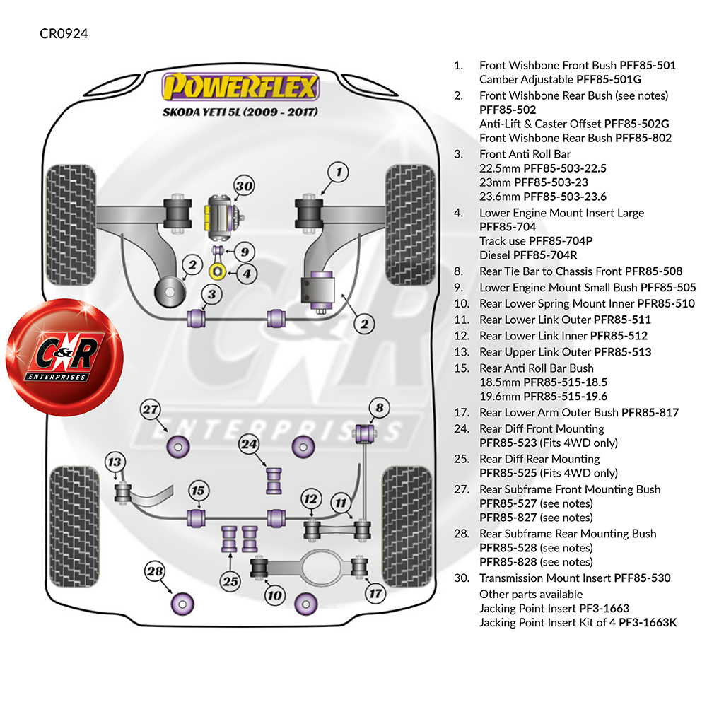 Um die richtige(n) Powerflex-Buchse(n) zu identifizieren, die Sie benötigen, sehen Sie sich bitte das Positionsdiagramm weiter unten in der Auflistung an.