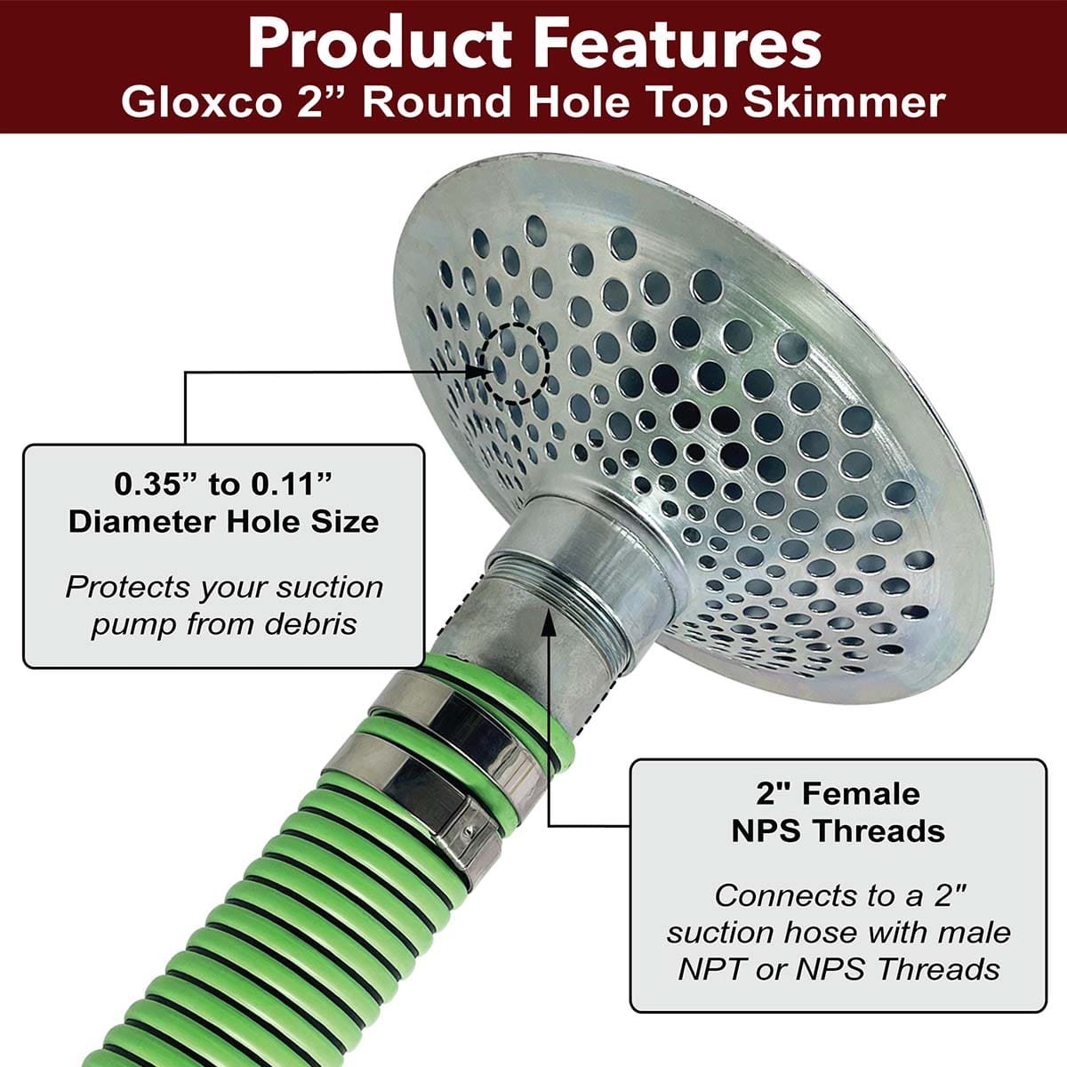 Gloxco Suction strainers are meant to be attached to the submersed end of a suction hose and is used to keep debris from entering your suction hose and pump.