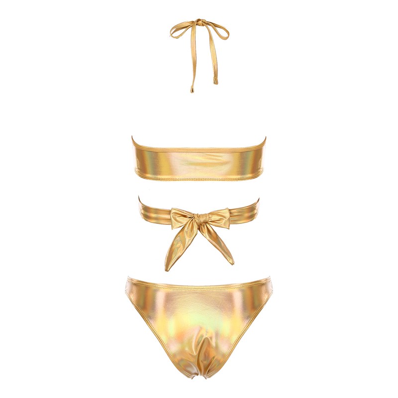 The sparkling three-piece outfits include removable padded bra top, lace-up hip skirt and thong.
