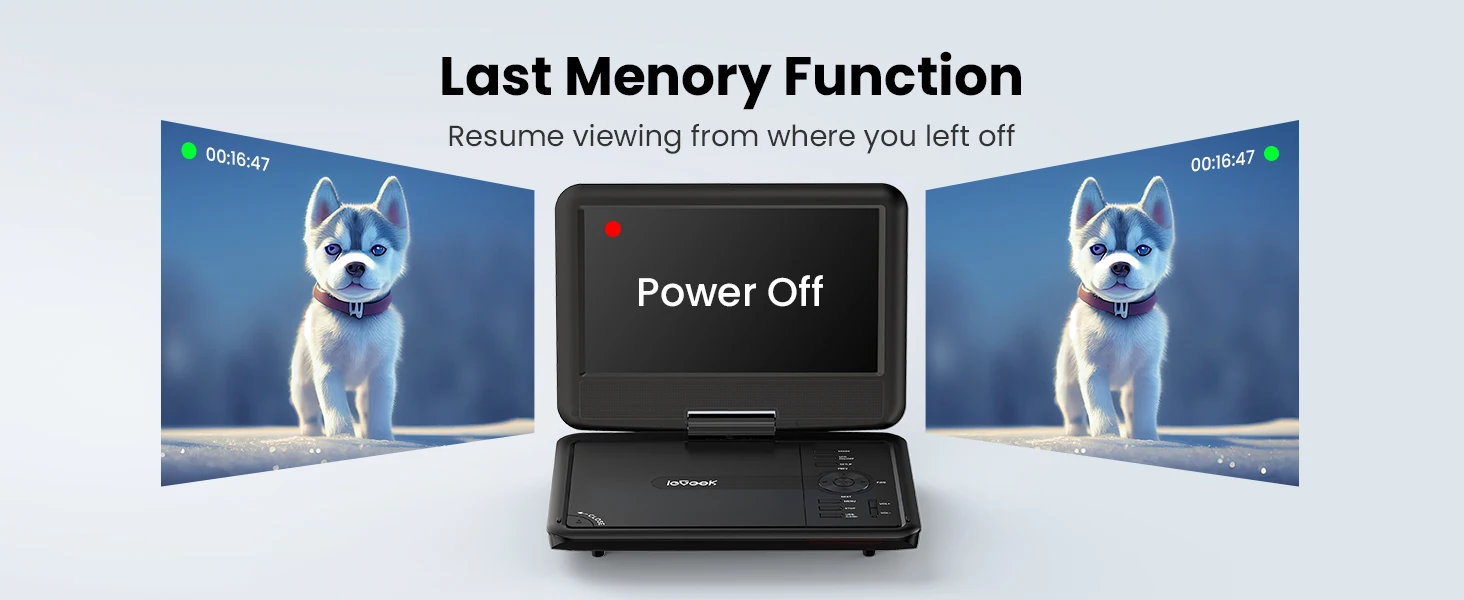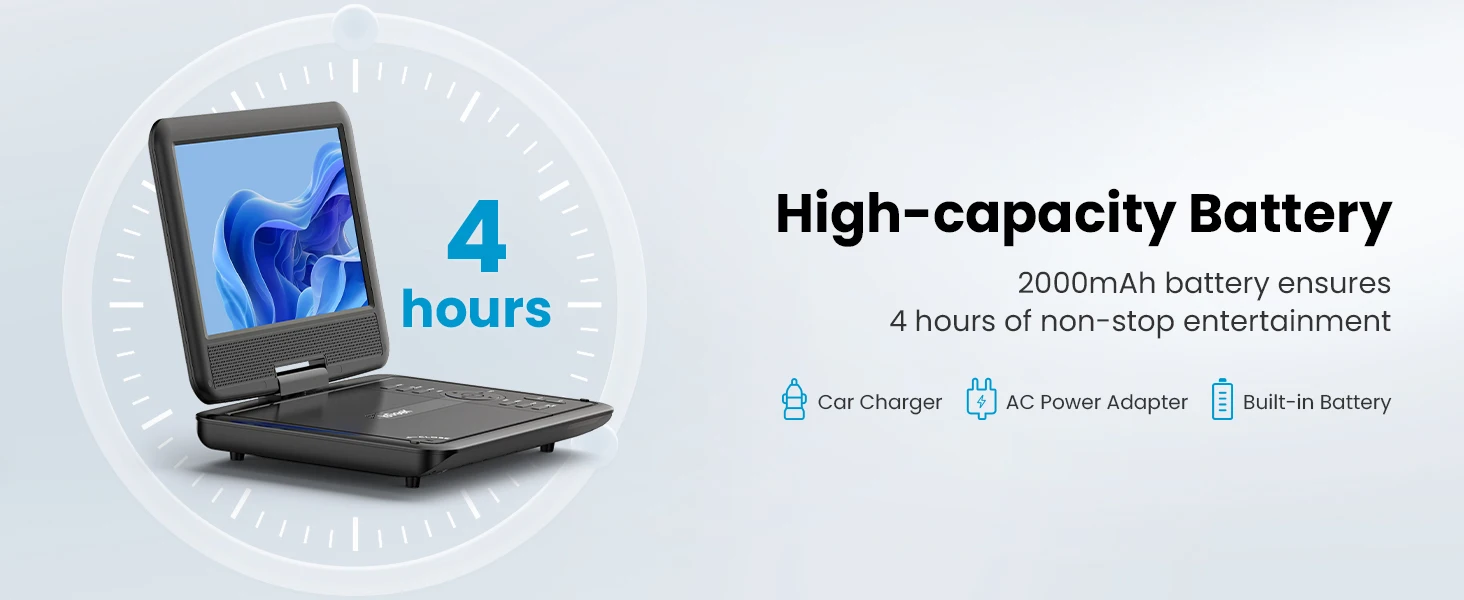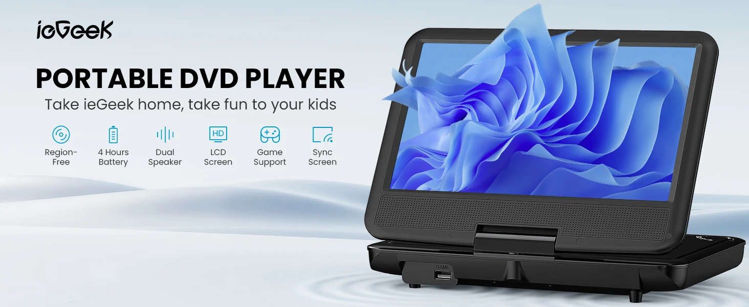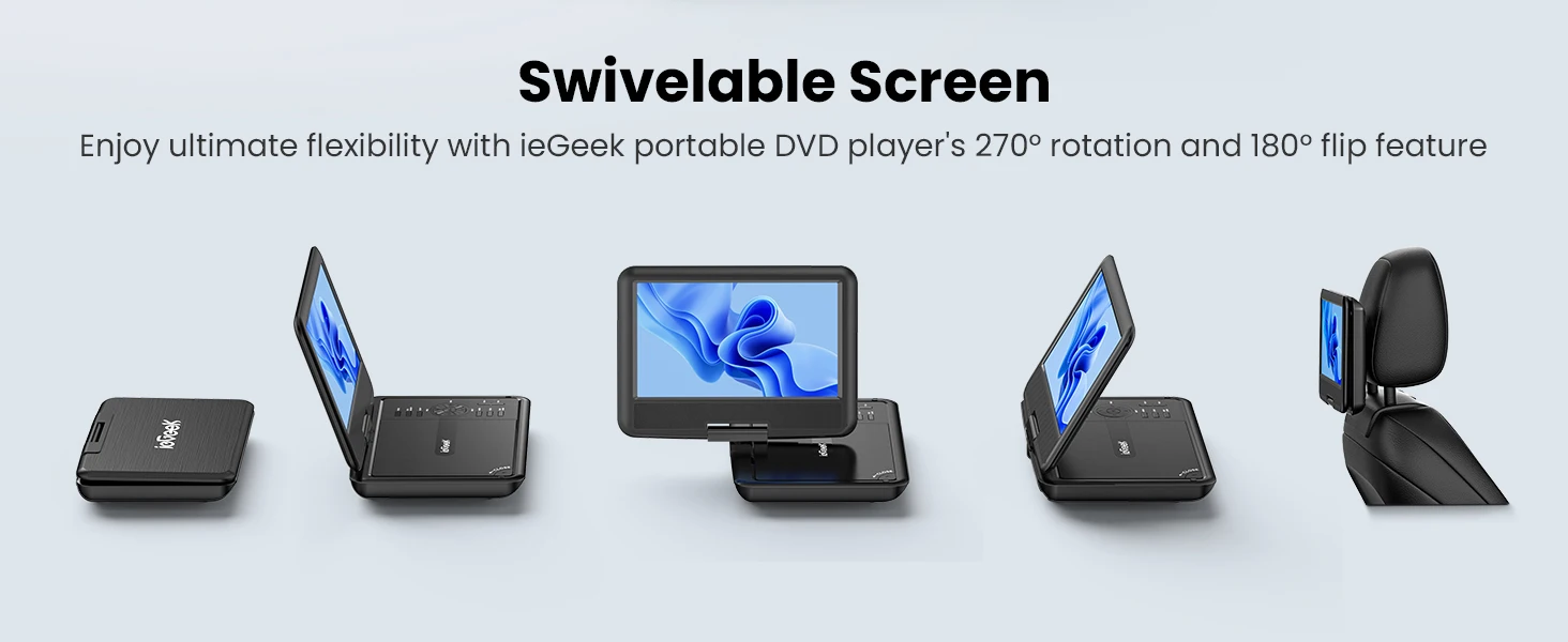 👨👩👧 Portable and Magical ---- Compact design makes it easy to carry out with you. Take it on your road trip, be companioned by your child, brings tons of fun for your journey. ieGeek DVD player can be easily swiveled as a tablet and mounted to the car headrest.
