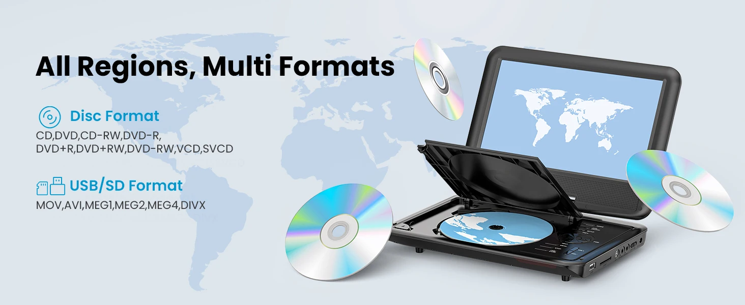 👨👩👧 All Regions, Multi Formats ---- Supports CD, DVD, DVD+R(-R), DVD+RW(-RW), VCD, SVCD-R(RW), CD-R(RW) from 6 regions (Blu-ray and pirated discs are not supported); ieGeek also supports multi-media files via USB and SD Card (16-32GB), such as VOB, AVI, MPEG, MP3, WMA, JPEG.