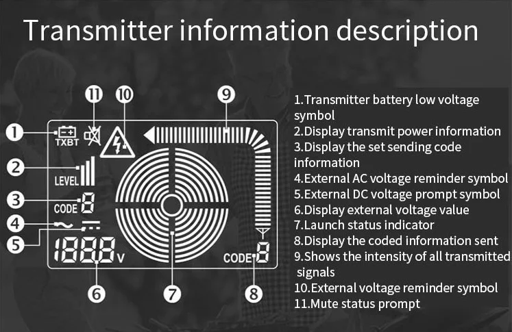 The screen of the receiver can display the transmitting power of the transmitter, transmitted codes, energy of the transmitters and its own batteries, AC voltage induced signal detected and warning symbol for mains voltage.