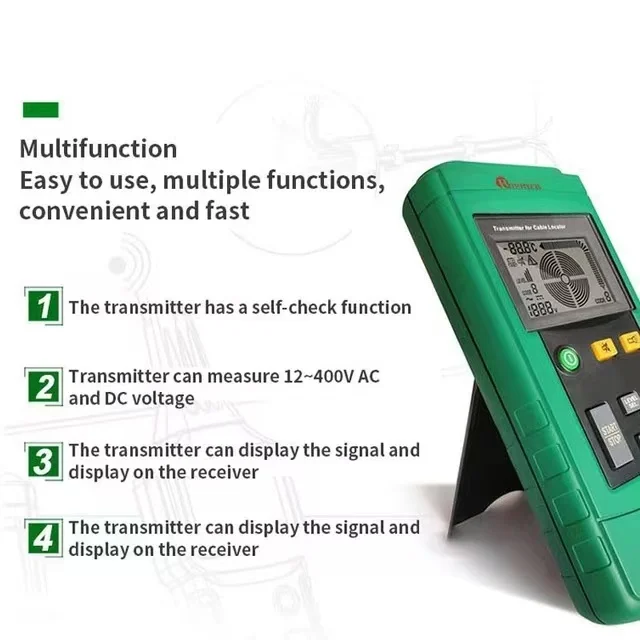 The transmitter is equipped with an AC/DC voltmeter function to linearly measure 12-400V AC and DC voltage.