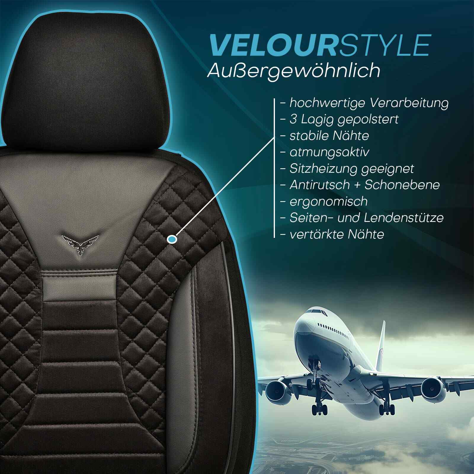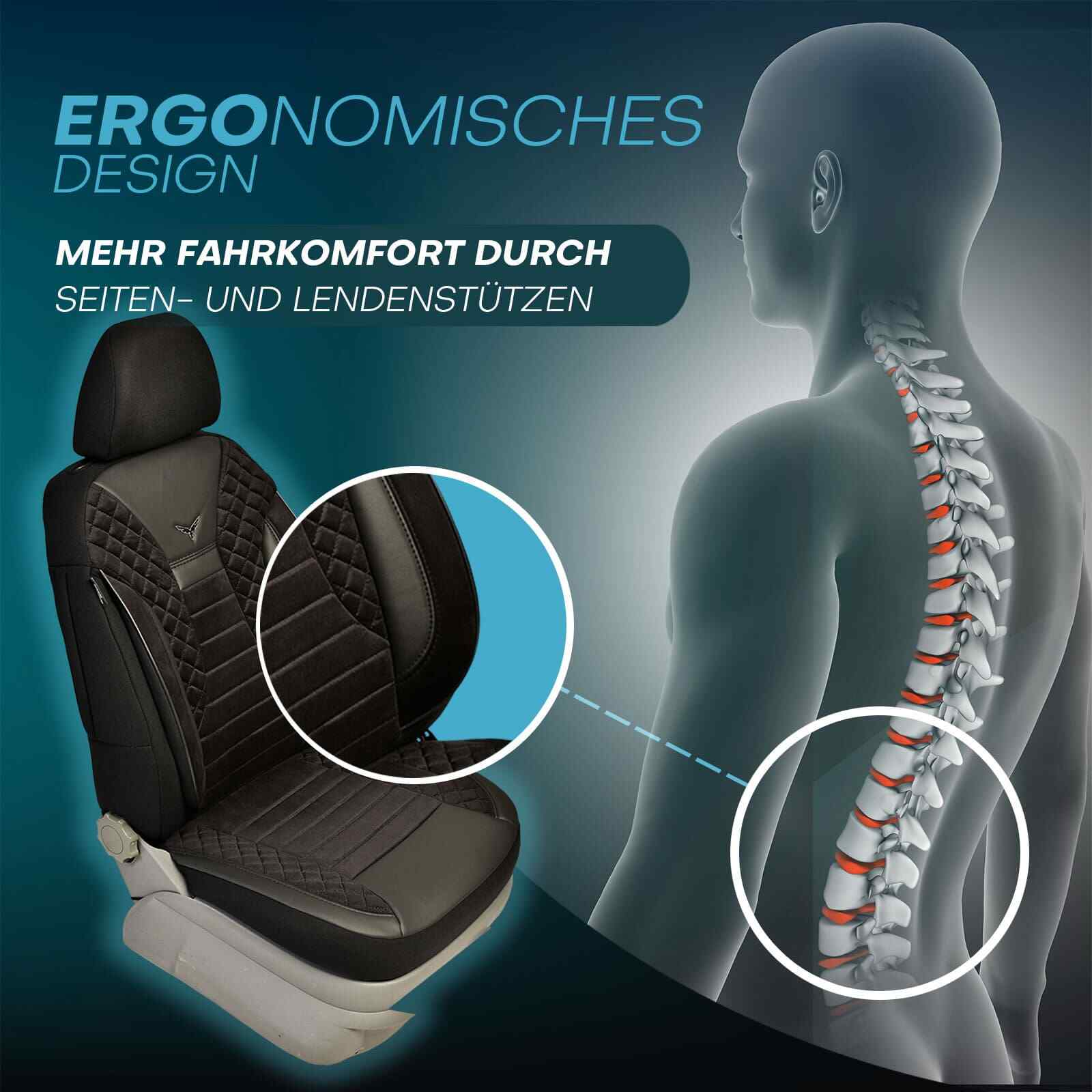 Die Sitzbezüge sind ergonomisch gestaltet und bieten sowohl Seiten- als auch Lendenstützen. Diese Merkmale bieten selbst bei langen Fahrten den größten Komfort. Außerdem sind die Sitzbezüge mit AIRBAG-Nähten für die Sicherheit der Passagiere ausgestattet.
