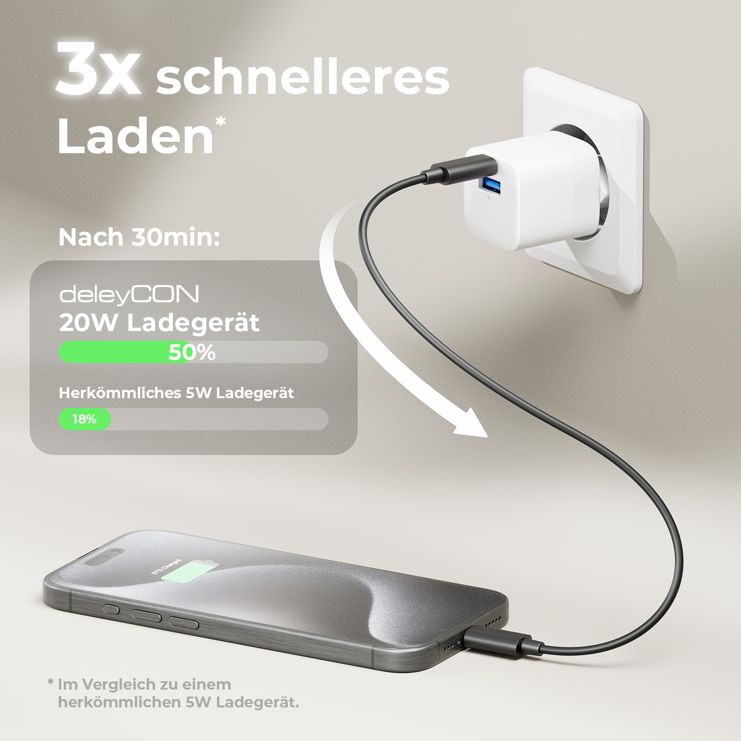 deleyCON Ladegerät USB A und C 2 Port USB Netzteil für iPhone & Handy PD 3.0 deleyCON USB A und C 20W Ladegerät – Schnelles und Kompaktes Netzteil für Alle Geräte