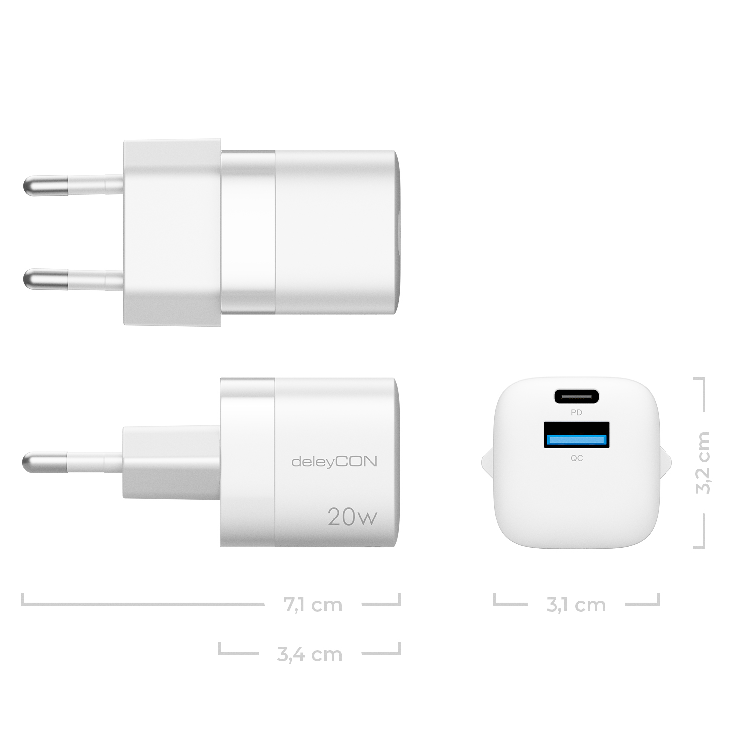 20W Gesamtleistung: USB-C = max. 20 Watt | USB-A = max. 18 Watt | USB-C + USB-A Laden = max. 15 Watt DUALES LADEN – Ermöglicht das Laden von zwei Geräten mit max. 15 Watt dank intelligenter Stromverteilung UNIVERSELLE KOMPATIBILITÄT: Kompatibel mit iPhone, Android, Tablets, Smartwatches und mehr KOMPAKT UND HANDLICH: Durch das schlanke Design passt das Ladegerät in jede Tasche und ist ideal für unterwegs SICHERE TECHNOLOGIE: Schutz vor Überladung, Überhitzung und Kurzschluss für sorgenfreies Laden Farbe: Weiß // Anzahl: 1 Stück // Größe: (B x H x T) 3,1 cm x 3,2 cm x 3,4 cm Modellnummer: MK5897 // Marke: deleyCON