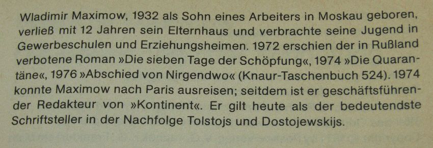 Autor: Wladimir Maximow * Titel: Die sieben Tage der Schöpfung Roman Reihe: Knaur Taschenbuch Band 659 (980) Verlag: