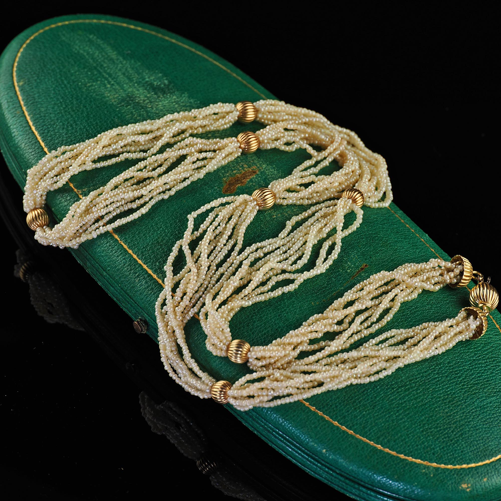Beautiful Vintage Estate 18K Yellow Gold Natural Seed Pearl Multi Strand Necklace. This gorgeous natural seed pearl multi strand necklace is crafted in 18k yellow gold. The necklace features eight strands of natural seed pearls with gold globe stations in between the length. The necklace is in good condition and sits beautifully on the neck.
