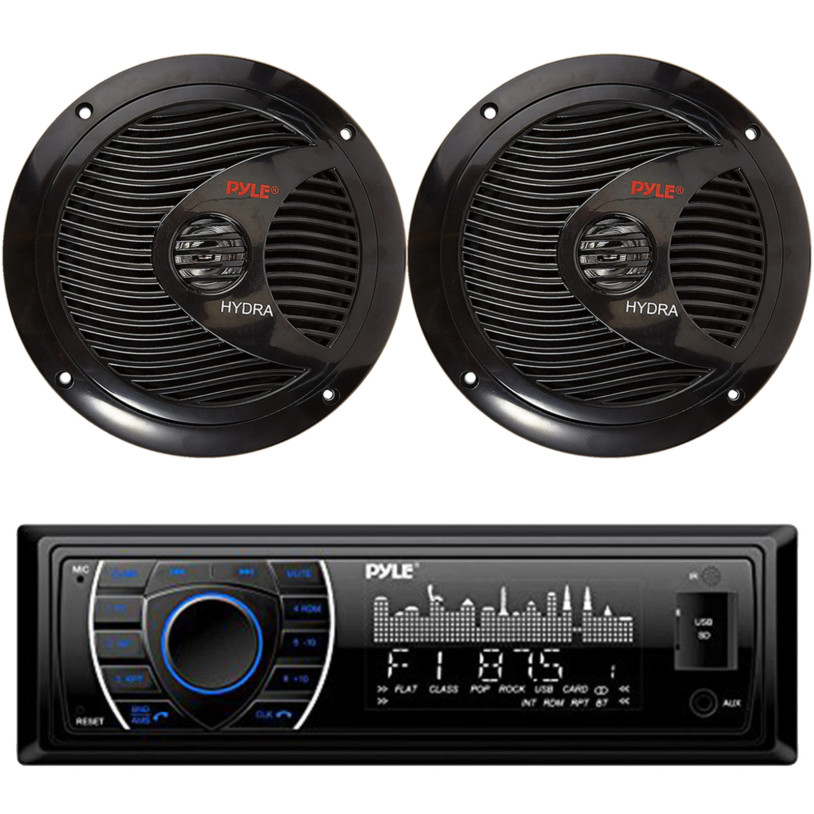 Pyle PLRMR27BTB Single DIN Marine InDash MP3 AUX Bluetooth Stereo Receiver Bundle Combo With One Pair (QTY 2) Of Pyle PLMR60B 6.5" 150 Watts Peak Dual Cone Waterproof Stereo Black Speaker
