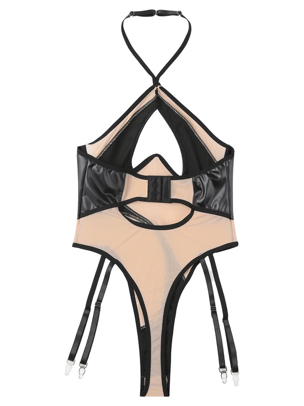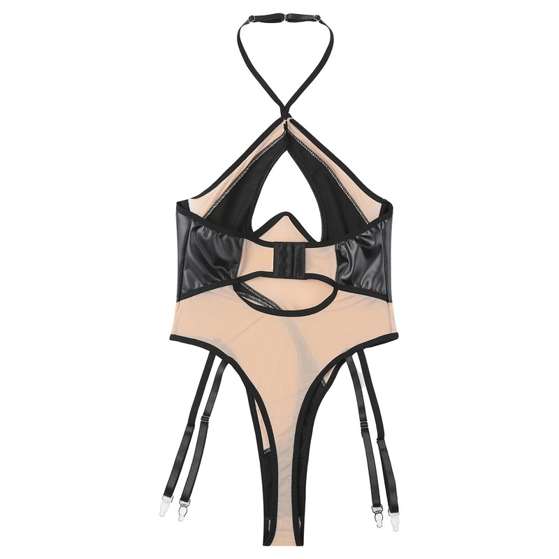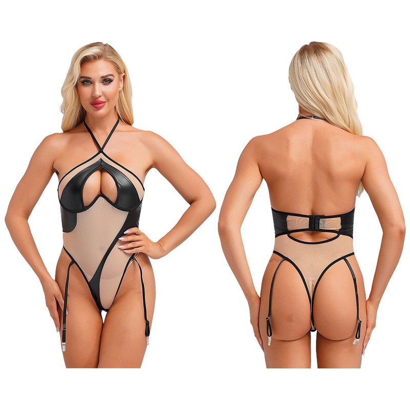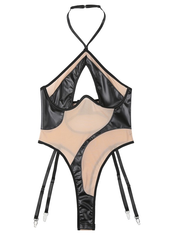 Stylisg mesh and PU leather patchwork. Mesh fabric fully show off your body. With straps for linking stockings