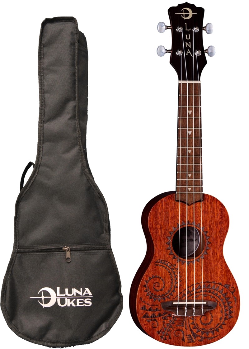Luna Mahogany Series Tattoo Soprano Ukulele, UKE TATTOO SOPRANO Through a sacred inking process, the laser-etched tattoo design on the Tattoo Mahogany Soprano takes its inspiration from Hawaiian body ornamentation. The patterns and layout were strongly geometric and there were many shapes and symbols which represented the natural island world: stones, waves, fish, sharks, turtles, rain, sun, birds. The ancient Polynesian people believed getting ink was a divine course and a bold statement. This design is primarily based on waves and sharks' teeth which are also echoed as fret markers. Expect a warm tone from the all- eastern mahogany soprano body and walnut fingerboard. Gigbag included. Join the Luna Tribe! SPECIFICATIONS