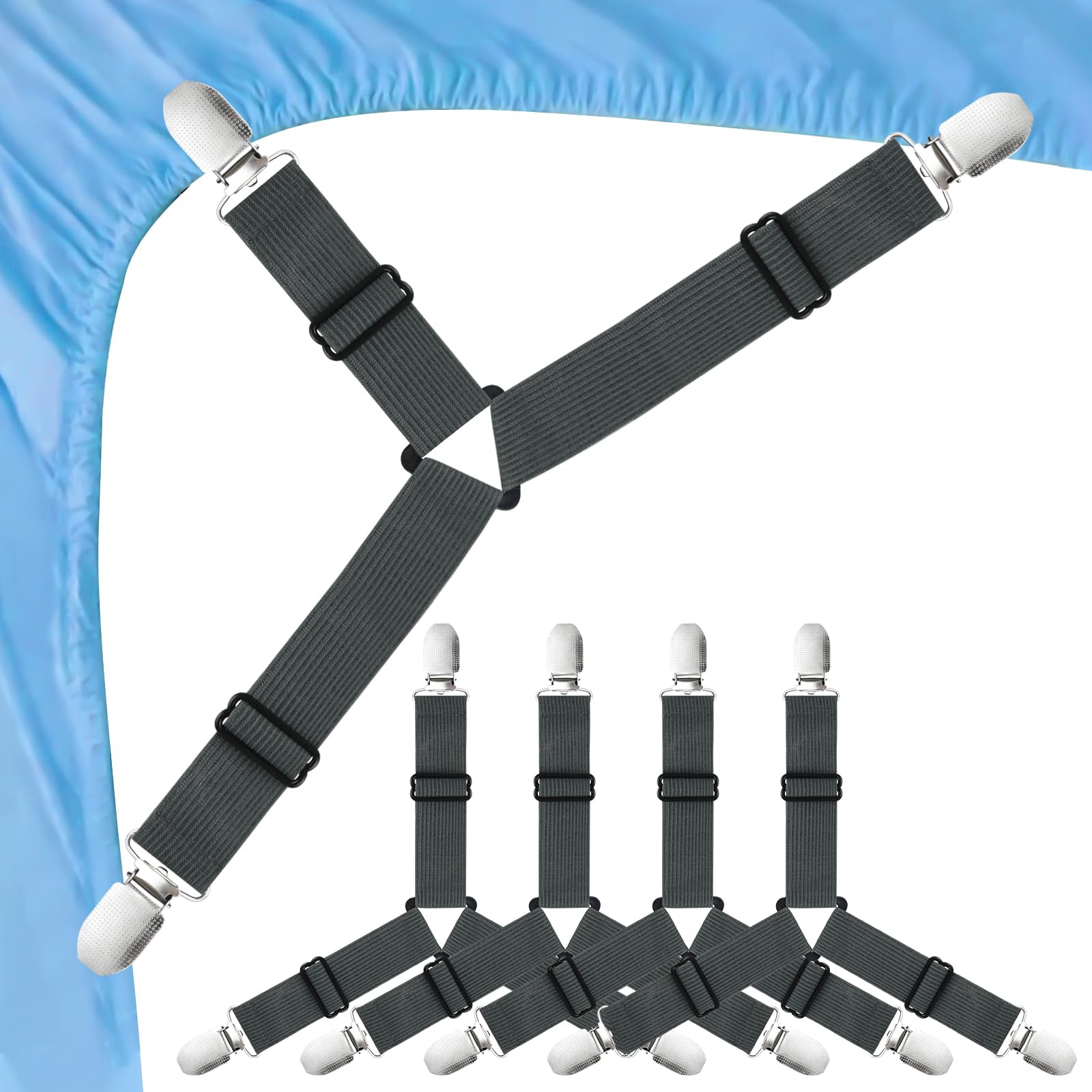 Specifications: Color: Grey Materials: Polyester & polyester blend, metal, plastic; Size: each elastic band is approx. 12.5cm/ 4.92" – 27cm/ 10.63"( as photo shown); Quantity: set of 4pcs. Features: Built-in plastic fastening system, stronger and safer protection sheets; Elastic bands & adjustable buckle, work with variety types of bed; Three-spoke design, most stable structure; Multi-scene use, suitable for most of bed, sofa, table, crid;