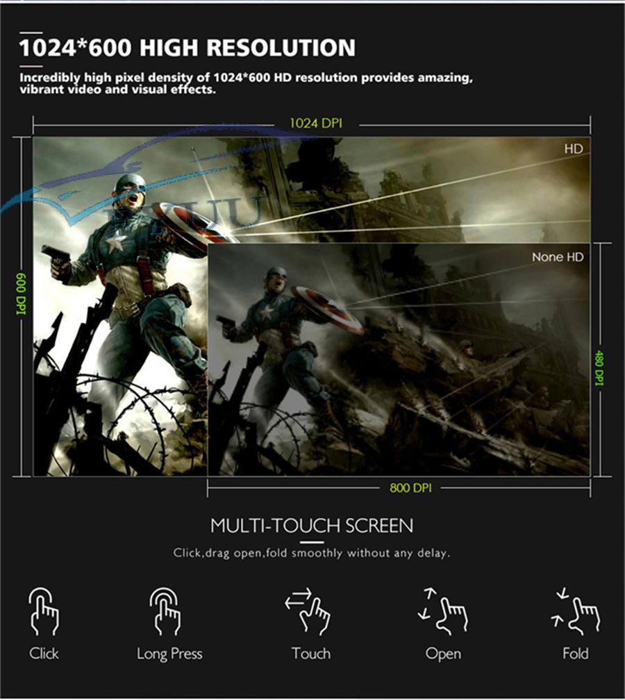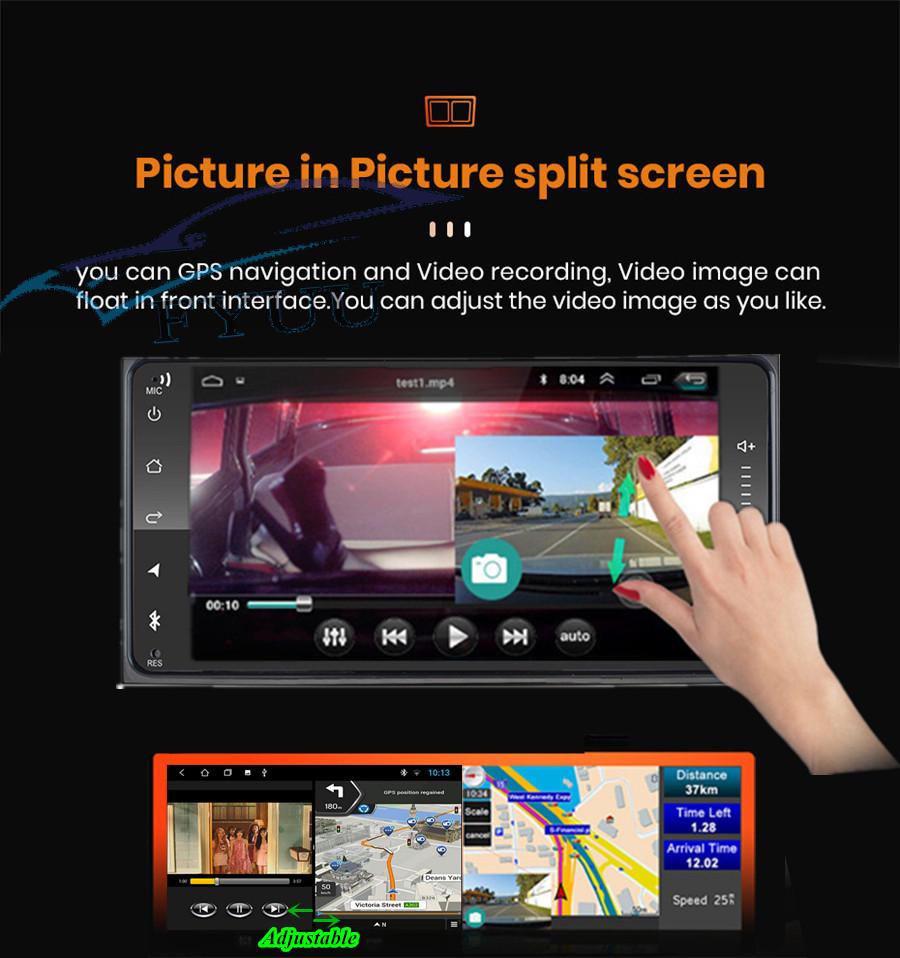 - Touch Screen: Yes - Resolution: 1024*600 - Capacitive or Resistance Screen: Capacitive - Built-in Clock and Calendar: Yes, show real time and can use network-provided time - Main Menu Status Bar display: Can be changed to Music/Radio/BT-Stereo Player and Clock/Date/Week - Change Apps-Icon Position: Yes - Picture in picture split screen:Yes Split screen feature enables you to use two applications at the same time. For example running Navigation with Music Player or Radio with Navigation at the same time. Optimum convenience for both the driver and passengers. |