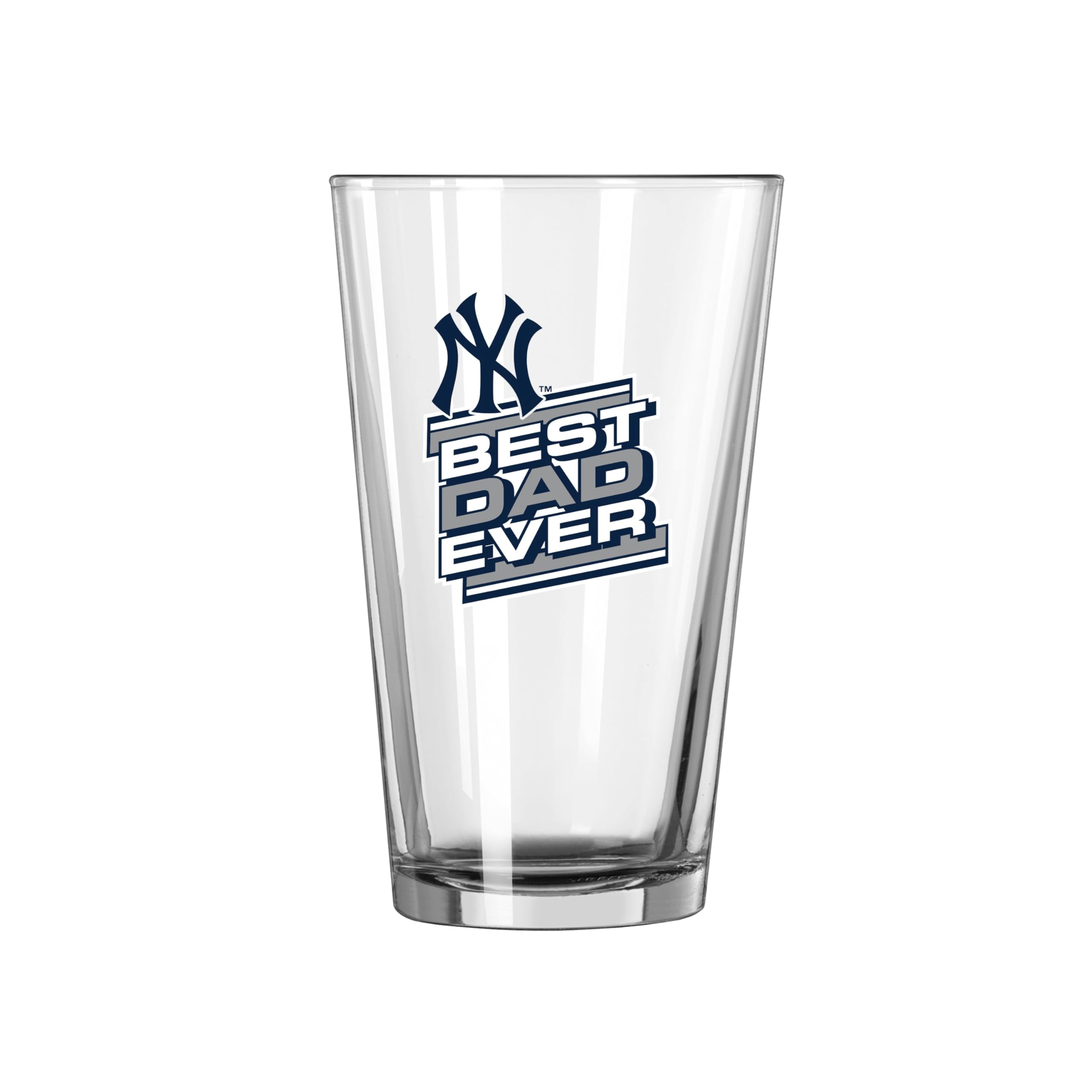 The LOGOSBRANDS NY Yankees Best Dad - 16oz Pint Glass is a stylish and officially licensed MLB beverage mug designed for New York Yankees fans. This 16-ounce pint glass features a durable, high-quality clear glass construction with a bold Yankees logo and the phrase "Best Dad Ever" printed in the team's classic navy blue and white colors.