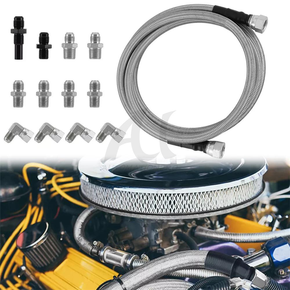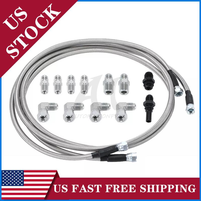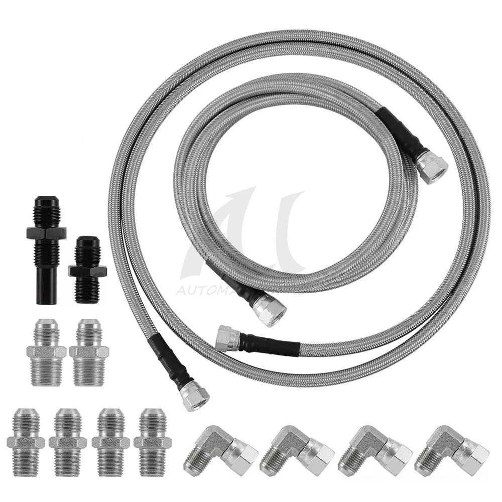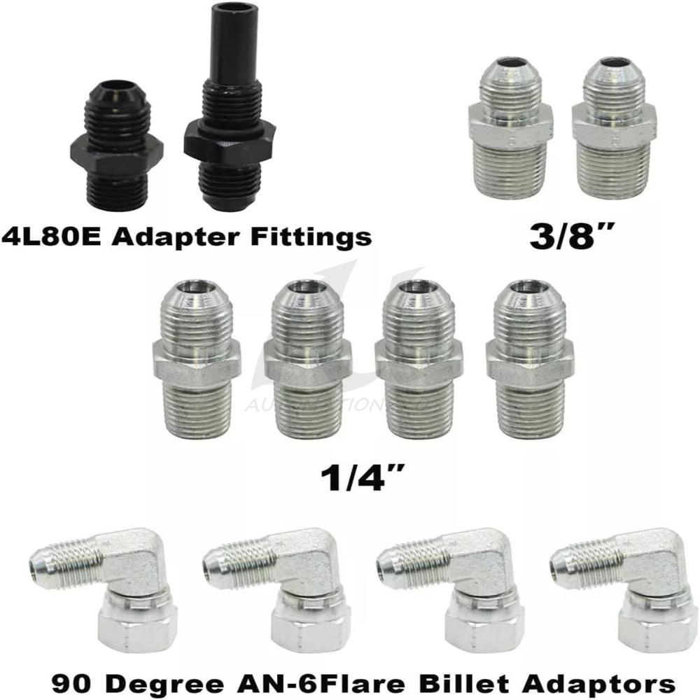 Package Included: 2 x about 70 inch & 3/8" I.D. Stainless Steel Braided Hoses; 4 x AN-6 flared to 1/4" NPT billet adaptors; 2 x AN-6 flared to 3/8" NPT billet adaptors; 4 x 90 degree AN-6 inverted flare to AN-6 flare billet adaptors;2 x Aluminum 4L80E adapter fittings