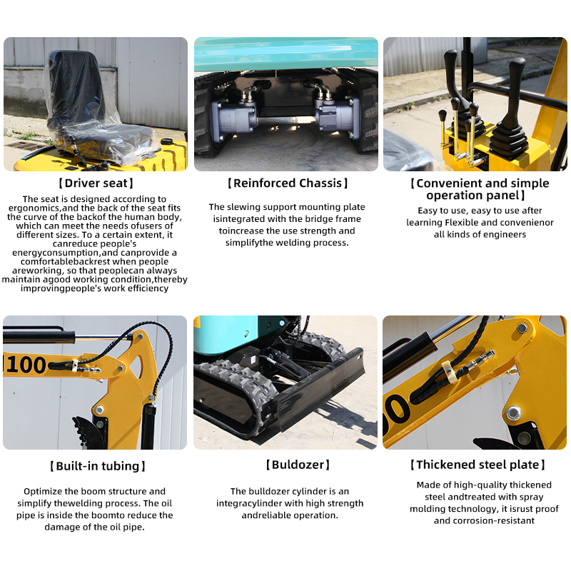 This small excavator can not only be equipped with a variety of hydraulic and non-hydraulic auxiliary equipment, such as rake, bucket, net fighting, pallet fork, mud bucket and wood grabber, but also can be equipped with quick change joints, making the replacement of auxiliary equipment is quick and easy.