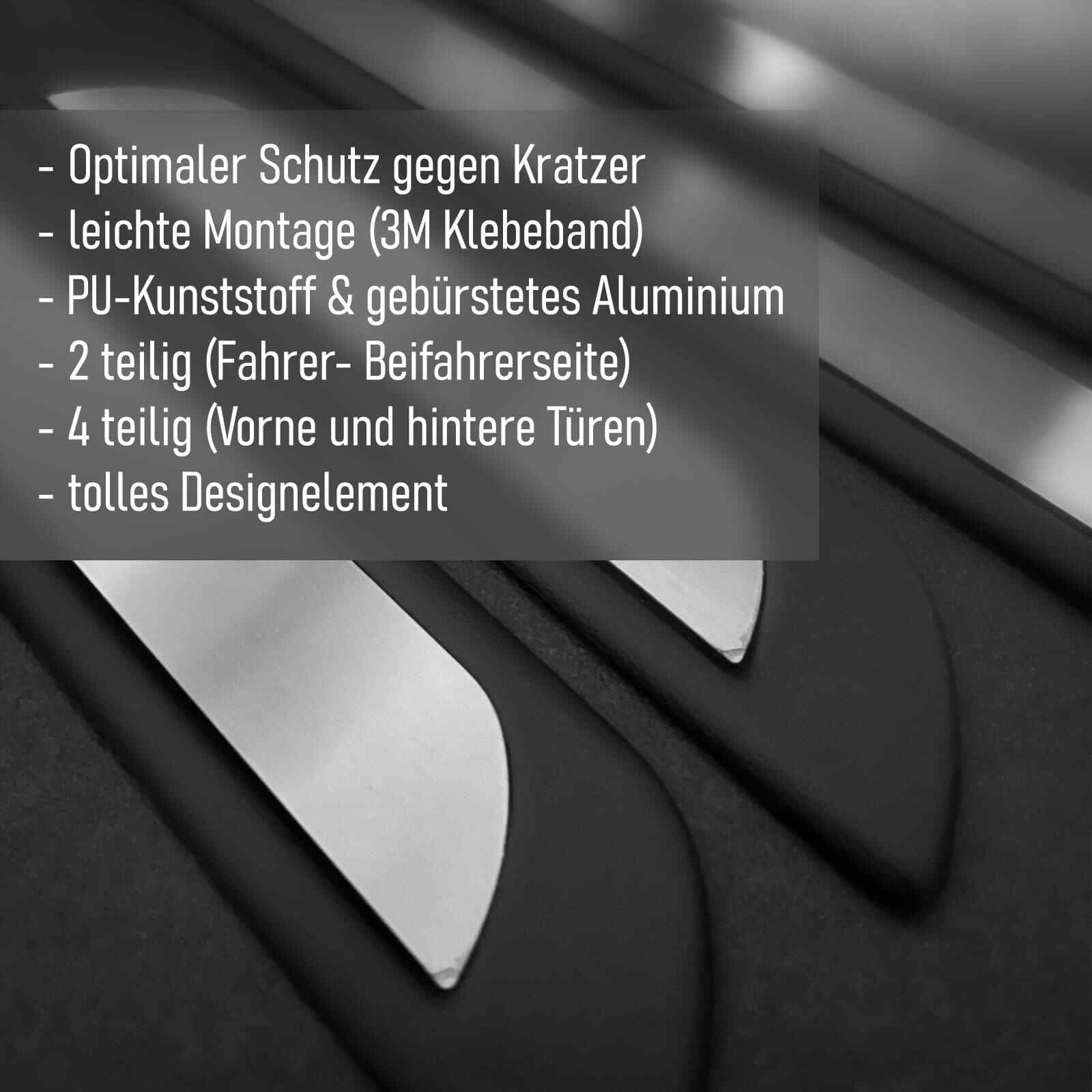 Schützen Sie die Schweller Ihres Fahrzeugs vor Kratzern, Schmutz und Beschädigungen mit diesen hochwertigen Einstiegsleisten. Das Set besteht aus gebürstetem Aluminium und ultraleichtem Polyurethan für eine edle Optik und robuste Haltbarkeit.