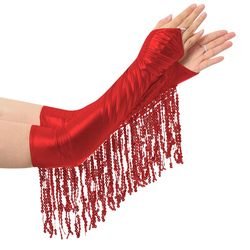 Metallic shiny gloves trim with sequin tassel, making you dazzling and eye-catching with each movement. The length is about 42.5cm/16.5 inch.