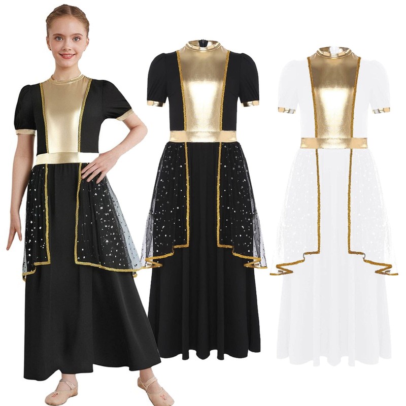 Designed with stand collar, short puff sleeve, ruffle trims, bowknots, integrated apron, back zipper, glossy surface and soft lining.