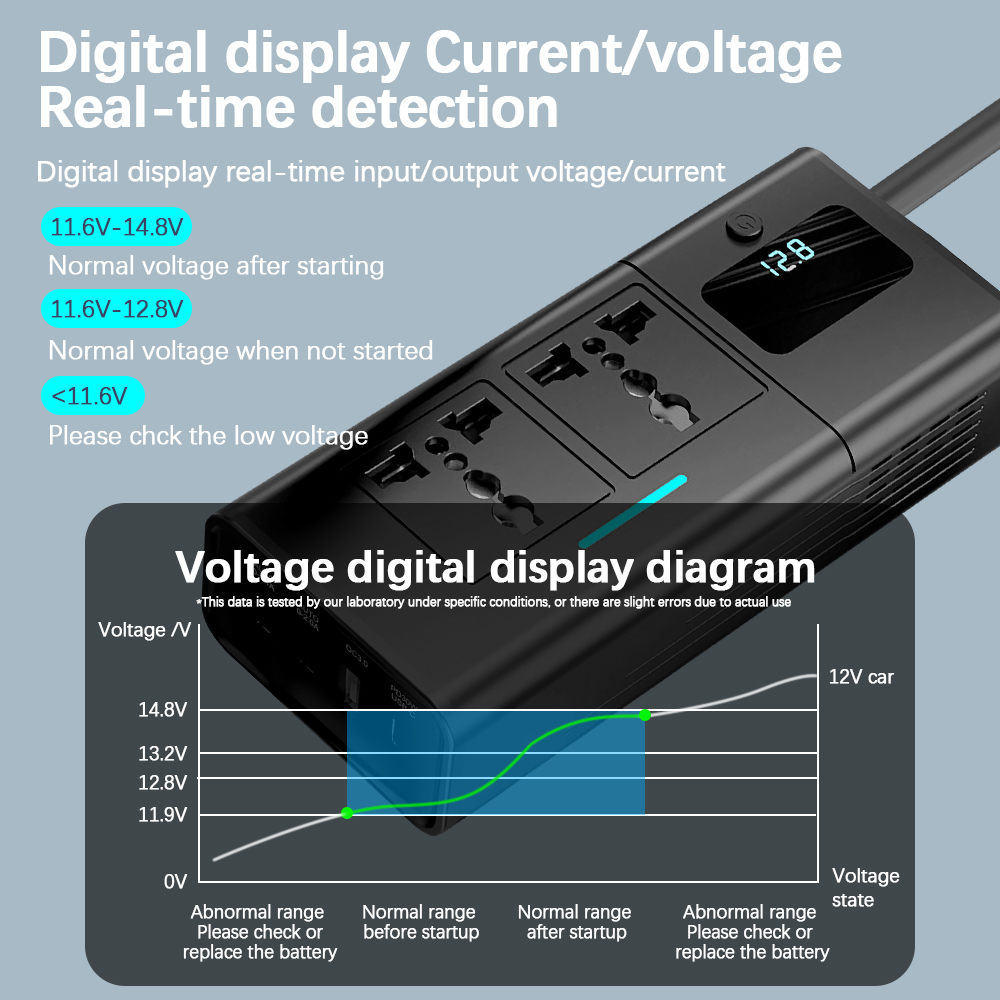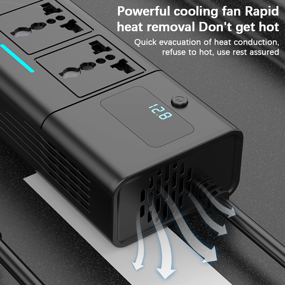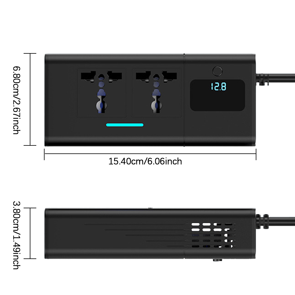 Suit for 12V Cars With cigarette lighter plug for easy use Independent AC Power switch, easy to turn off AC device The device's total rated power is 200W Safety : Input over-voltage protection (>16V will be protected) Output over-load protection (>230W will be protected) Overtemperature protection (±85℃will be protected) Short circuit protection: support When in protect mode, the AC indicator shows orange With cooling fan design, prevent heating for long-time use More functions: Length=60cm power cable View the car battery voltage when ACC is on (Engine off status) Support various standard plug: EU plug/US plug/Aus plug/Japan plug/Korea plug,etc.(Please check the AC plug table on the details page) Attention(Before Payment): More functions: Do not use it on 24V vehicles. Please check the car fuse for cigarette lighter must be no less than 20A before use. Otherwise, the car fuse will burn out due to insufficient current. Package Included: 1 PCS xCar Inverter
