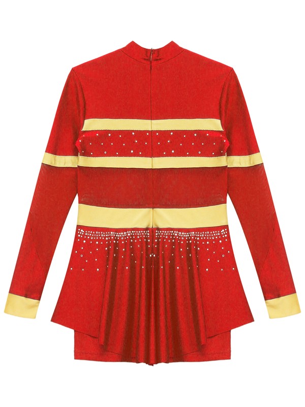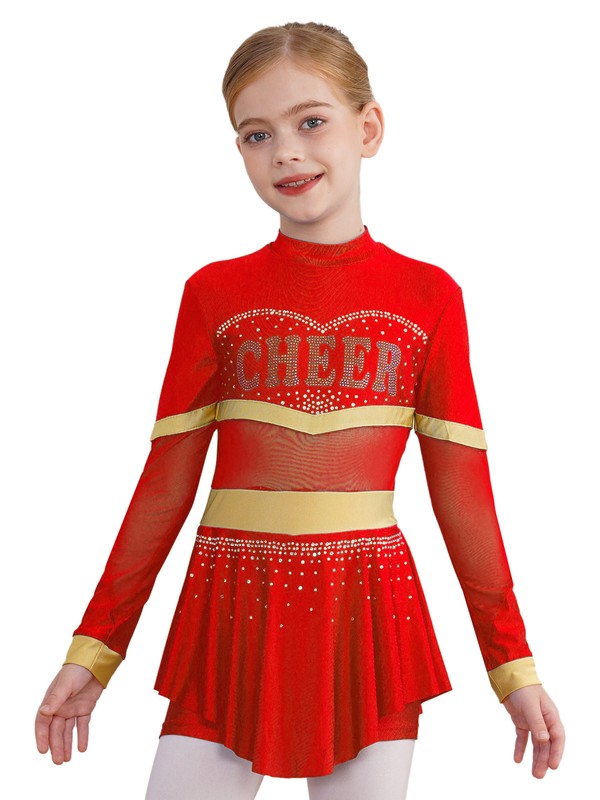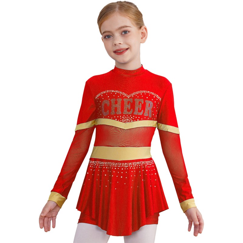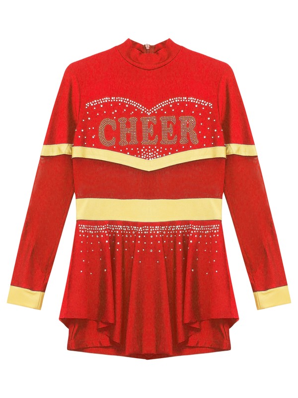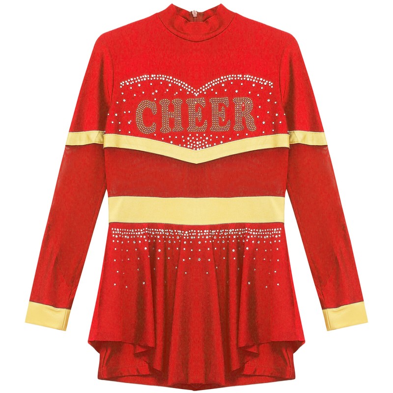 One piece cheer leader costume for girl, with mock neck, long sleeve, and back zipper closure.