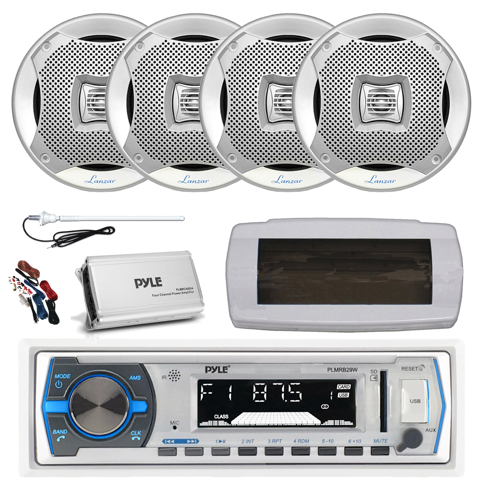 Pyle PLMRB29W Single DIN Bluetooth Marine MP3 AM/FM Stereo Receiver with White Cover, Long Range Antenna, Amplifier w/Kit, 4x 6.5" 400W Max 2-Way Water Resistant Audio Speakers (Silver)