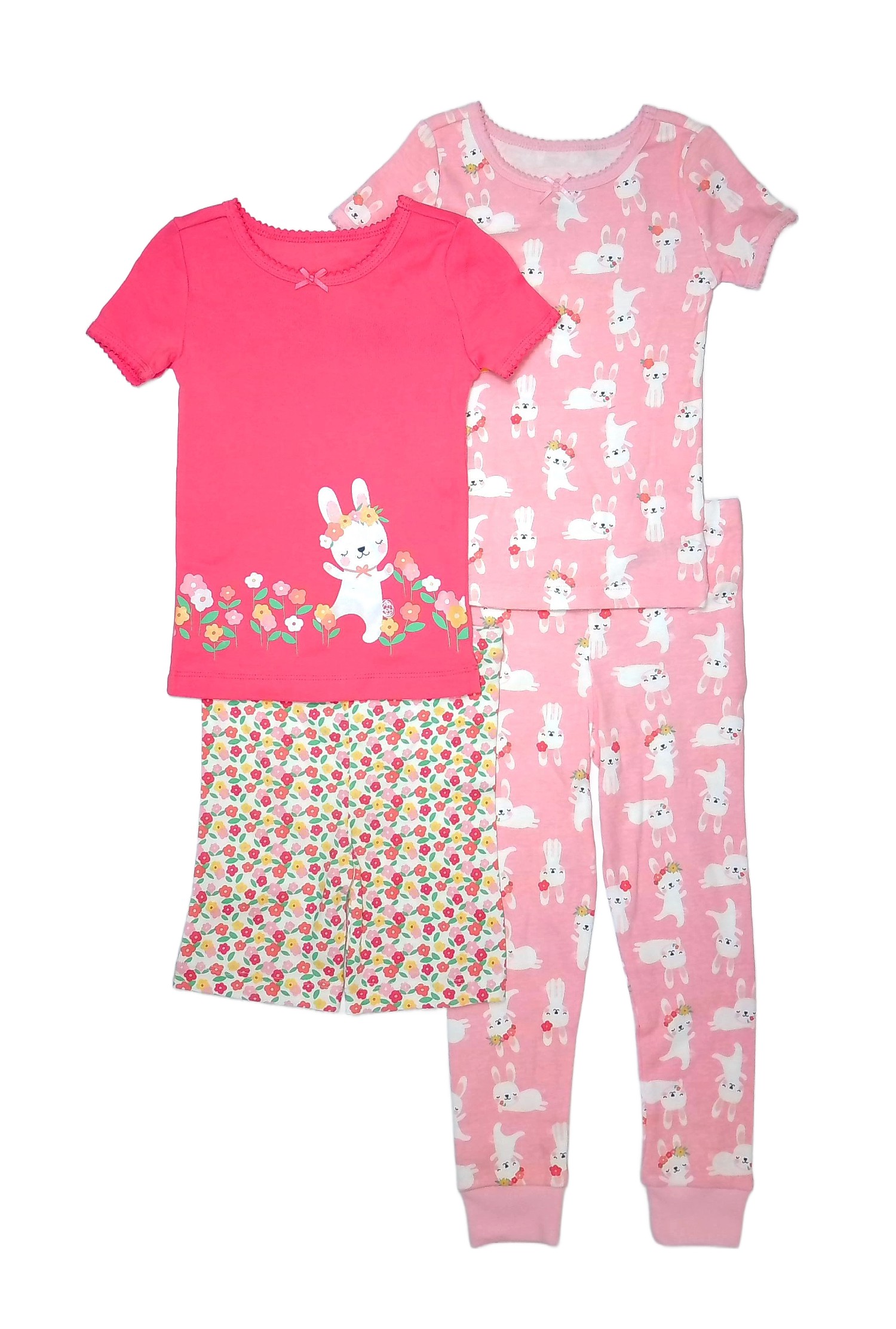 She'll be ready for springtime in cozy, cute comfort and style in this versatile 4-piece pajama set. It includes two short-sleeved tops, one featuring a sweet and colorful Bunny and floral-themed applique and the other an adorable Bunny print against a pastel pink background. Rib-knit collars with picot edging and small satin accent bows add to the charm. Coordinating print pajama pants and shorts with elasticized waistbands that lend for a custom fit. Crafted of a soft cotton fabric, to be worn snug-fitting.