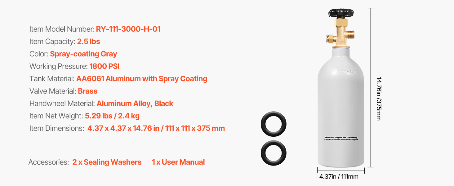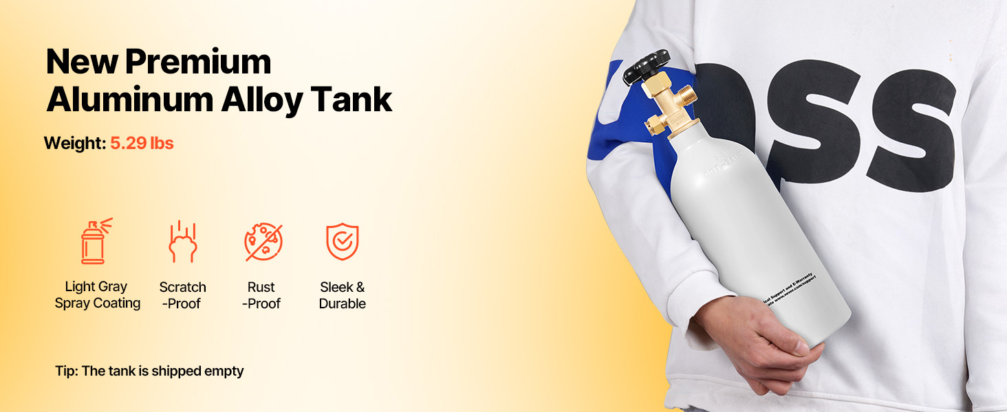 Compact, Durable 2.5 lbs CO2 Tank: Our CO2 tank boasts a lightweight 5.29 lbs aluminum alloy body for exceptional strength and resistance. The light gray spray coating enhances its visual appeal and keeps the tank from wear and tear. Tip: The tank is shipped empty