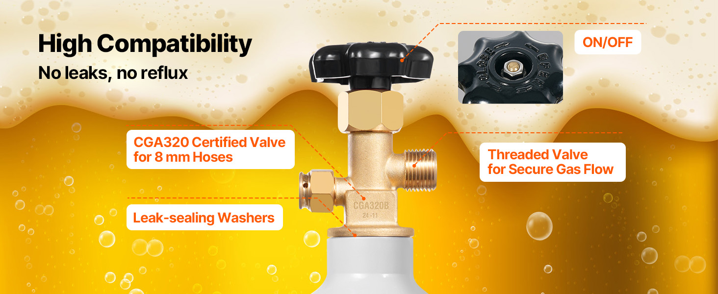 Leak-proof Design: Our CO2 gas tank contains a CGA320 standard valve, compatible with 8 mm hoses and featuring external threading for CO2 regulators. Additionally, it comes with washers to effectively stop gas leaks for peace of mind
