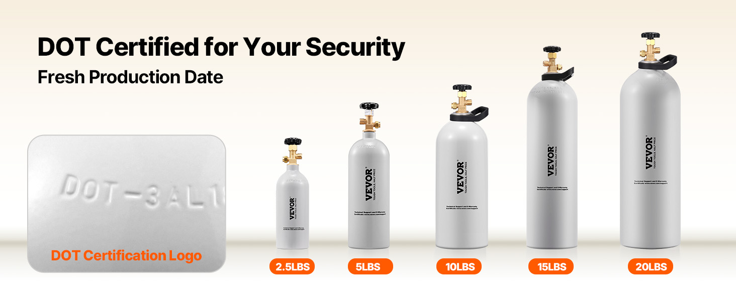 Our CO2 gas tank is DOT-approved, featuring all necessary external markings. Each unit is stamped with a fresh production date, ensuring you receive a brand-new, reliable aluminum CO2 tank.