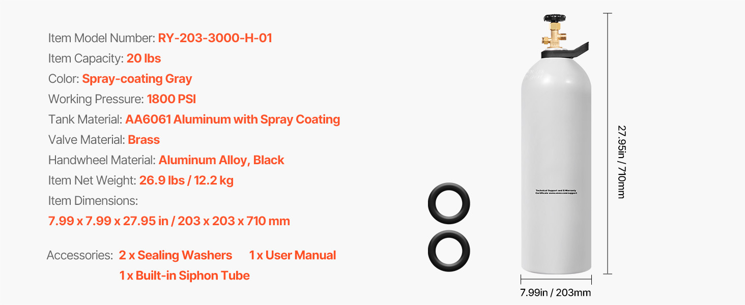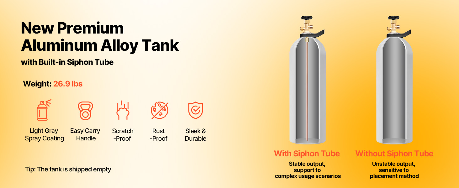 Compact, Durable 20 lbs CO2 Tank: Our CO2 tank boasts a lightweight 26.9 lbs aluminum alloy body for exceptional strength and resistance. The light gray spray coating enhances its visual appeal and keeps the tank from wear and tear. Tip: The tank is shipped empty