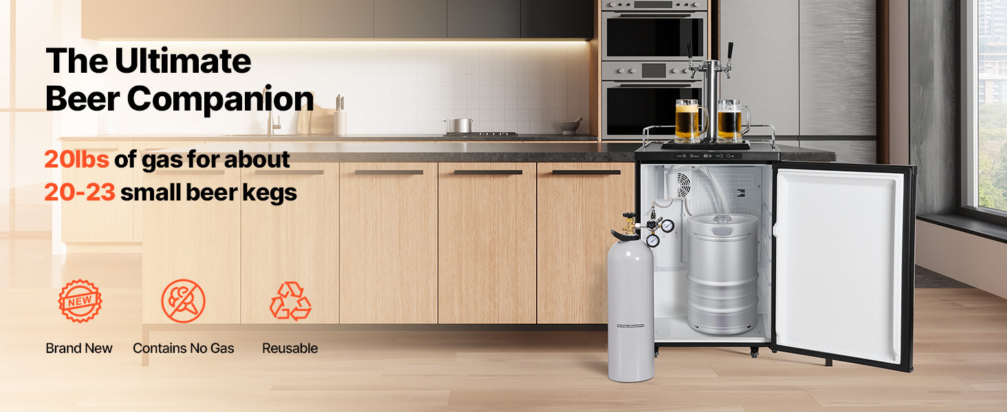 Your Go-to Beer Companion: Designed without pre-filled gas, our CO2 cylinder tank can be loaded with 20 lbs of food-grade, 99.95% pure CO2 compliant with E290 standards. It's reusable and ideal for dispensing around 20-23 small beer kegs, making it an essential addition to any beer enthusiast's setup