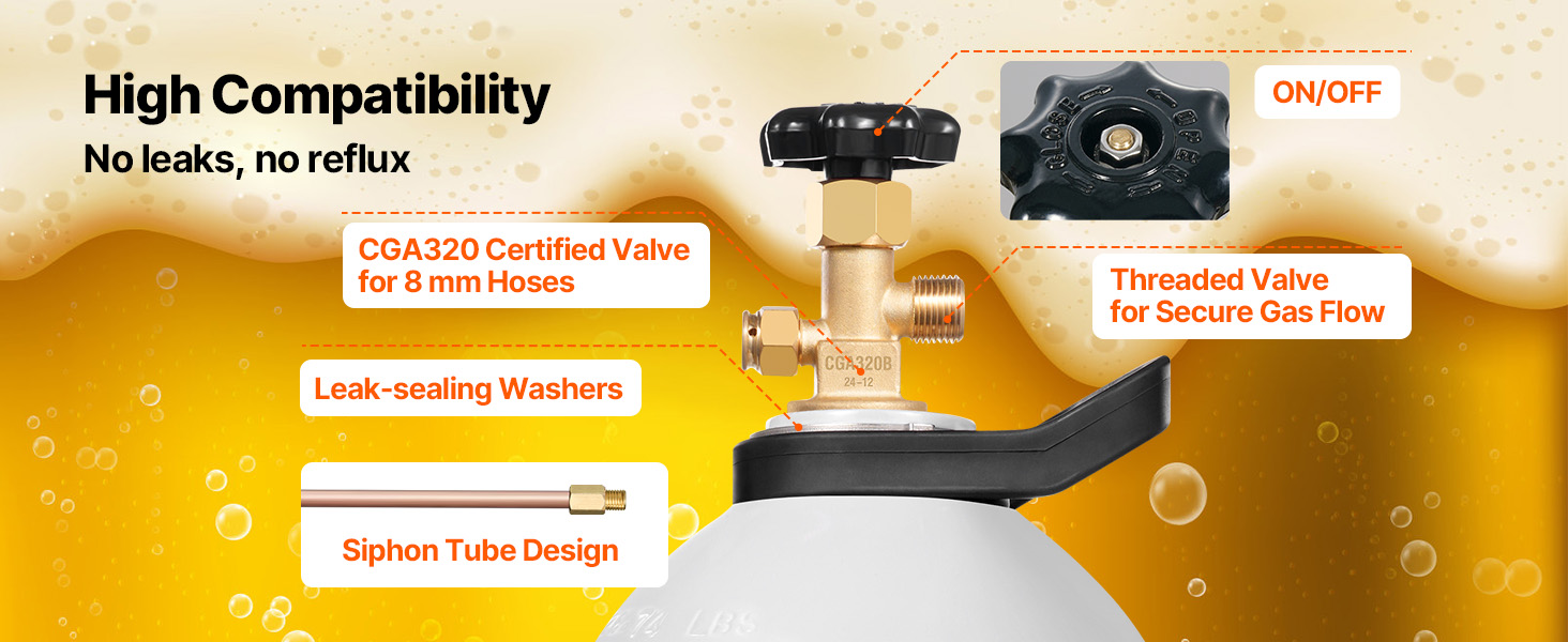 Leak-proof Design: Our CO2 gas tank contains a CGA320 standard valve, compatible with 8 mm hoses and featuring external threading for CO2 regulators. Additionally, it comes with washers to effectively stop gas leaks for peace of mind