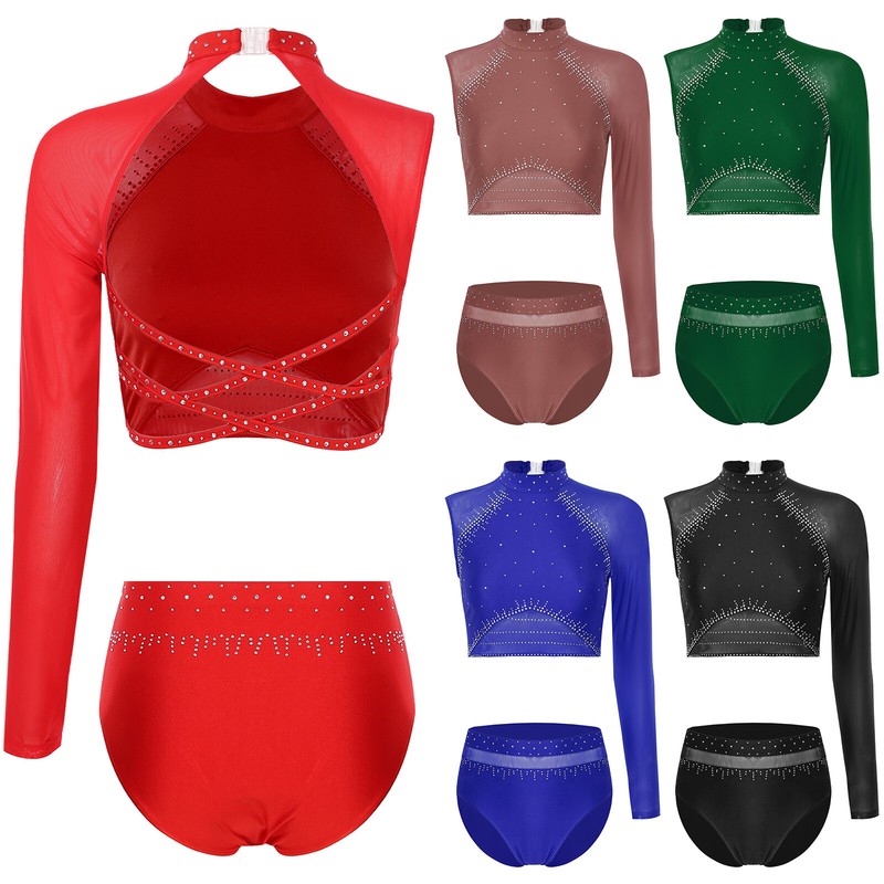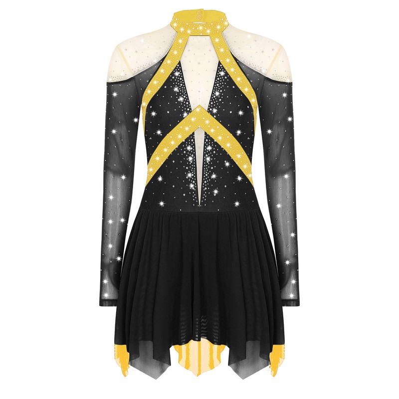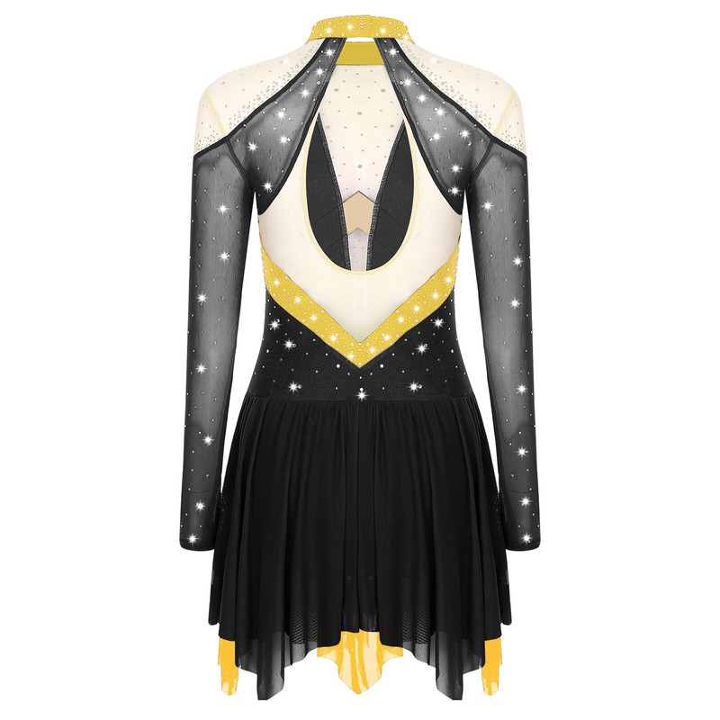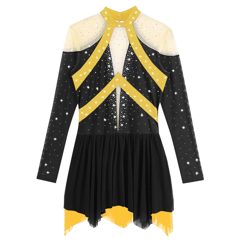 Color block and sheer mesh patchwork design with sparkling rhinestones to make you the spotlight in any performance.