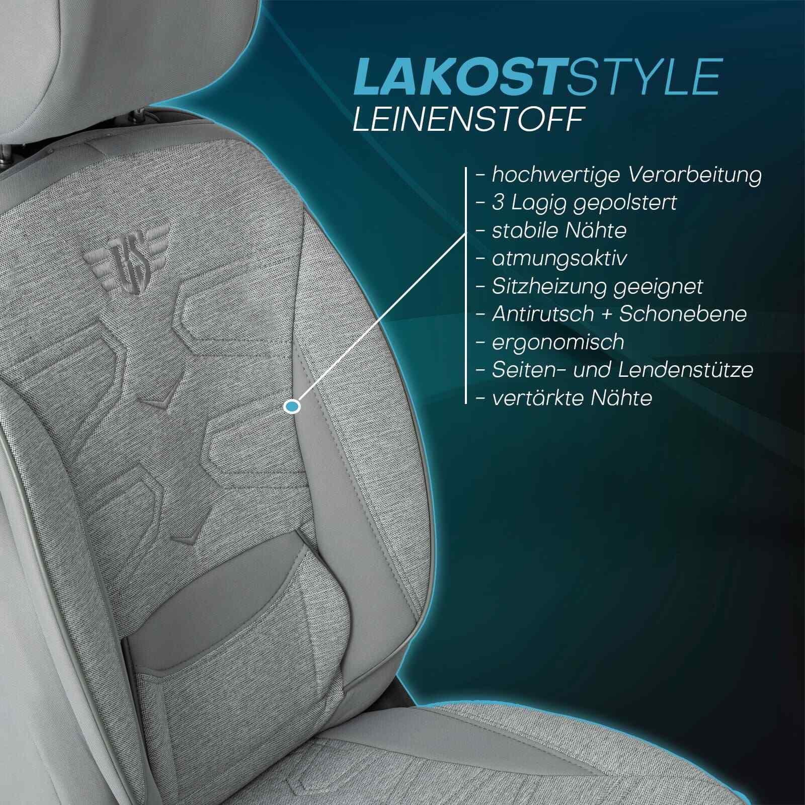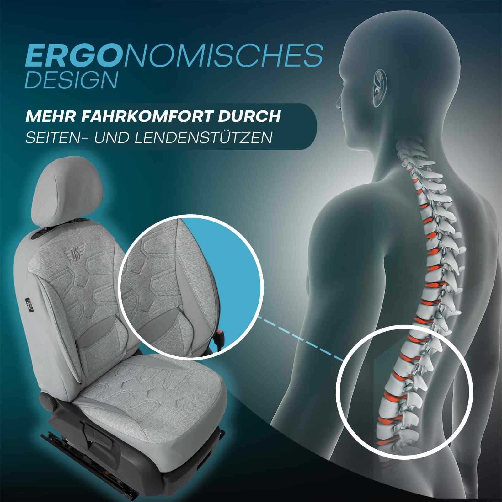 Die Autositzbezüge haben ein ergonomisches Design, das sowohl Seiten- als auch Lendenstützen bietet. Auch bei langen Fahrten bieten diese Merkmale den höchsten Komfort. Außerdem sind die Sitzbezüge mit AIRBAG-Nähten für die Sicherheit der Passagiere ausgestattet.