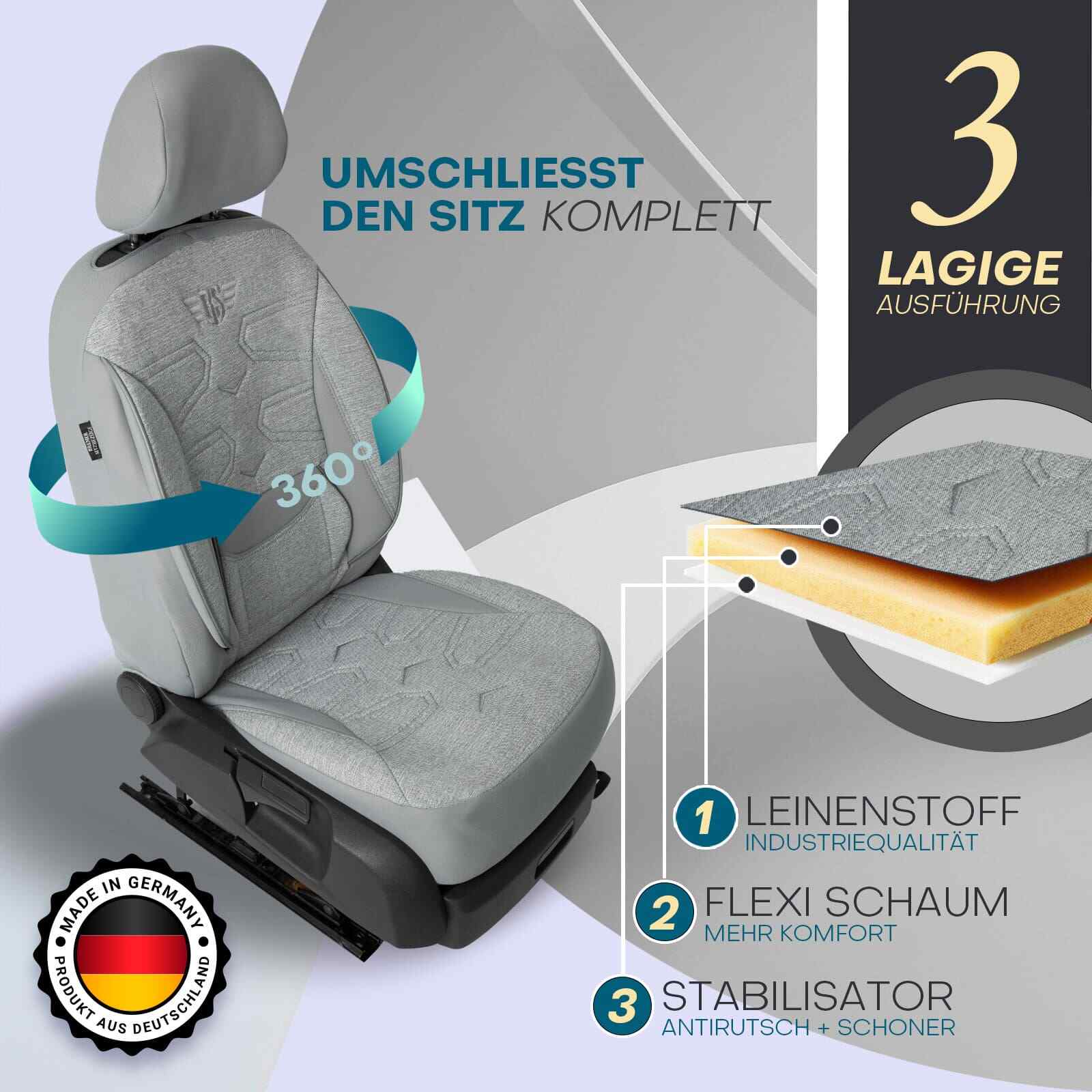Die hochwertigen Materialien der Bezüge sind robust, wasserabweisend und leicht zu reinigen. Damit bieten sie langanhaltenden Schutz vor Schmutz, Flecken und Abnutzung.