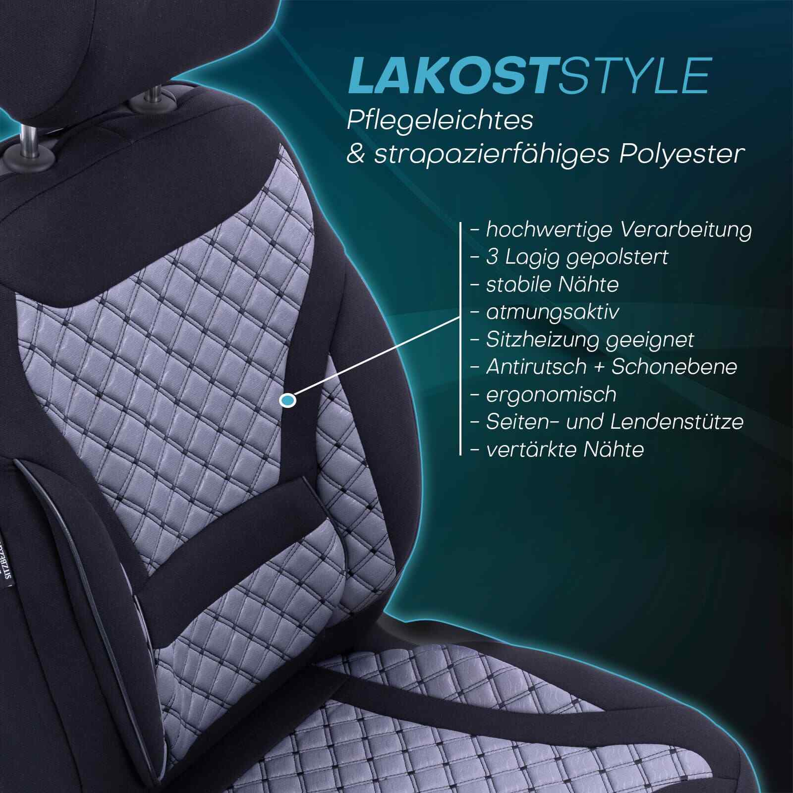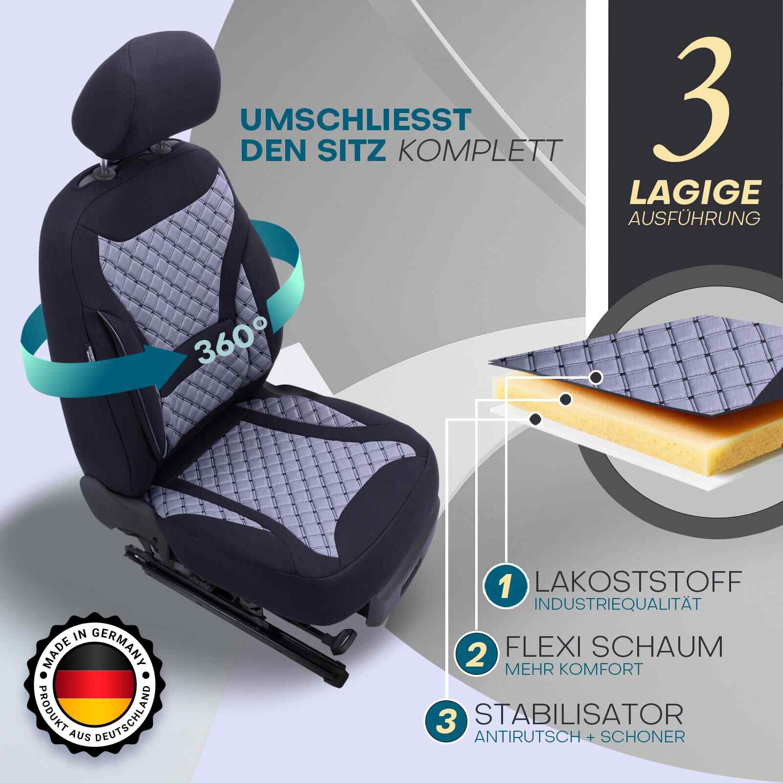 Die stabile Nähte und die Verwendung von hochwertigen Materialien aus der Automobilindustrie gewährleisten eine lange Lebensdauer der Sitzbezüge. Die dreilagige Konstruktion bietet Antirutscheigenschaften und hilft dabei, die Form der Bezüge selbst nach längerem Gebrauch zu erhalten.