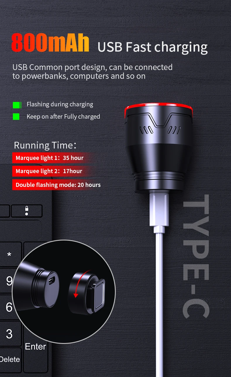 【USB C RECHARGEABLE】Built-in a 800mAh rechargeable battery, keep running for 17-50 hours under the flashing light mode after fully charged. (If you use 2 hours one day, you can use 10 days)