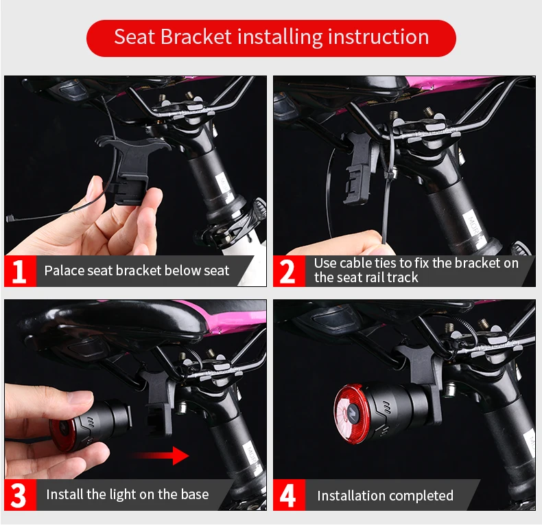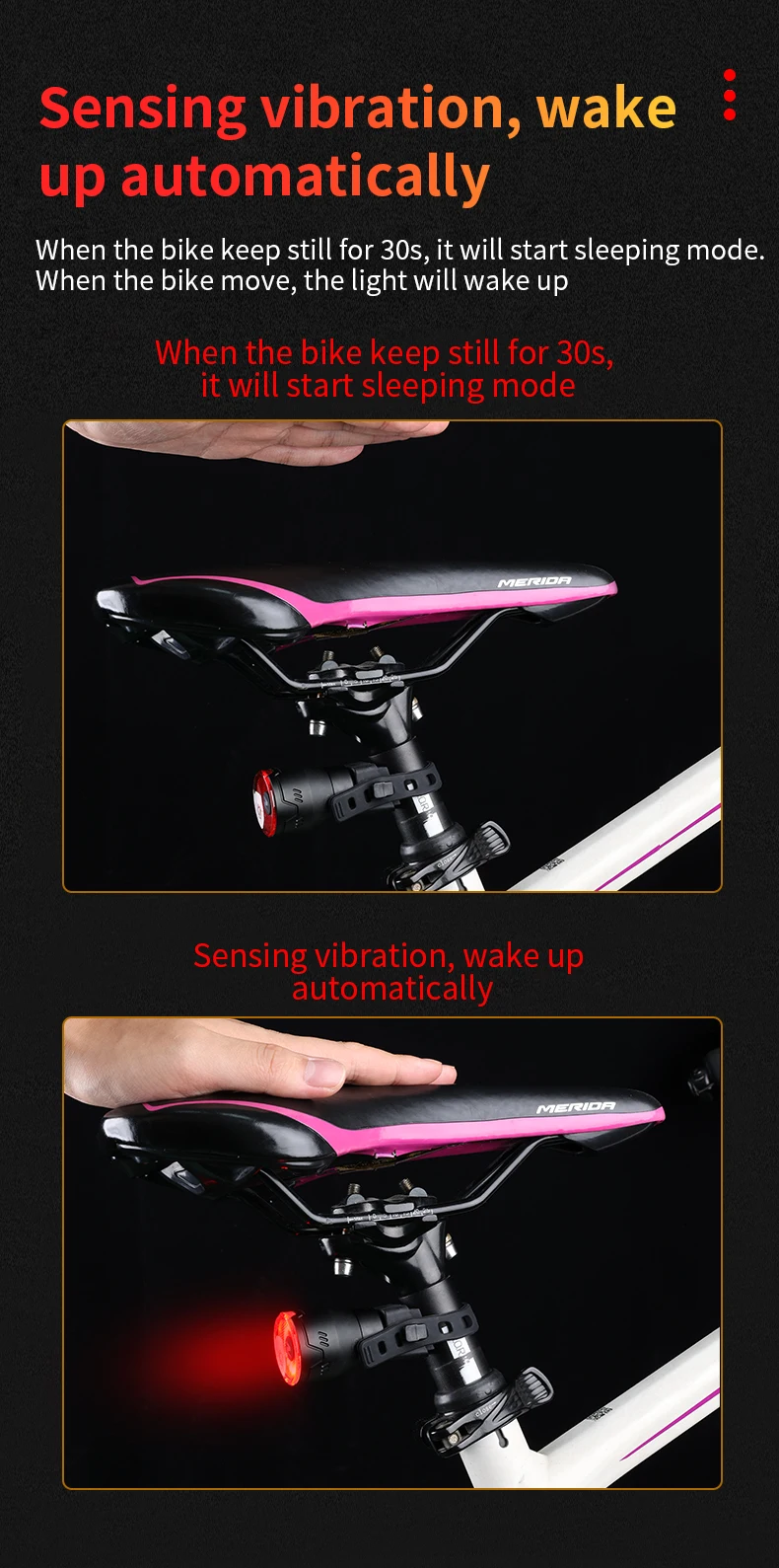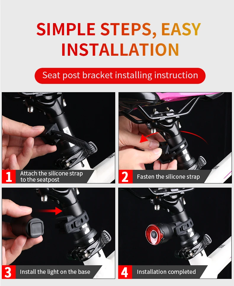 【Smart & Standard Version】Installed it on the handlebar, easy to switch the lighting modes of the bike rear light by holding 3 seconds of the button. Total 3+1 lighting modes: (Steady with running mode 1, running mode 2, double flash + strobe).
