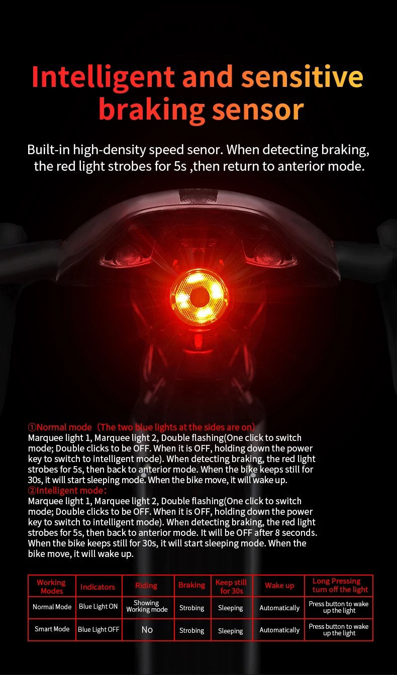 【AUTO BRAKE LIGHT】The light will flash light to remind the cars and pedestrians behind you when braking. Warning any possible incoming vehicle to further increasing visibility.